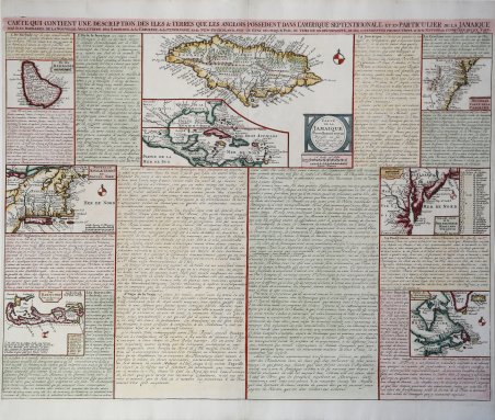 Interessante foglio dell'Atlas Historique di Chatelain che illustra e descrive le rivendicazioni territoriali britanniche in Nord America e nelle Indie Occidentali. Sono raffigurati il New England, la Virginia, le Caroline, il Canada, le Bermuda e le Barbados. La mappa della Giamaica occupa un posto di primo piano, con un inserto della mappa di tutti i Caraibi. ' Tutte le mappe sono accompagnate da descrizioni informative sulla popolazione, la storia e i prodotti dei territori raffigurati. Carta geografica tratta dall'Atlas Historique, pubblicato ad Amsterdam tra il 1705 e il 1720.L'atlante, in 7 volumi, è innovativo per la sua epoca perché combina le mappe geografiche con incisioni e informazioni di carattere geografico, storico, etnografico e araldico.Incisione in rame, finemente colorata a mano, in perfette condizioni. Henri Abraham Chatelain (1684 - 1743) era un pastore ugonotto di origini parigine. È meglio conosciuto come cartografo olandese e più specificamente per il suo contributo cartografico nell’Atlas Historique ' in sette volumi, pubblicato ad Amsterdam tra il 1705 e il 1720. Innovativo per il suo tempo, l'Atlas Historique ' combinava incisioni e opere d'arte con studi di geografia, storia, etnologia, araldica e cosmografia. Alcuni studiosi suggeriscono che l'Atlas Historique ' non fu compilato esclusivamente da Henri Chatelain, come si crede comunemente, ma piuttosto fu un'impresa familiare che coinvolse Henri, suo padre Zacharie e suo fratello, sempre Zacharie. An attractive and interesting sheet from Chatelain's Atlas Historique depicting and describing British territorial claims in North America and the West Indies. New England, Virginnia, the Carolinas, Canada, Bermuda, and Barbados are all shown. A map of Jamaica takes pride of place front-and-center, with an inset map of the whole Caribbean. ' Each are accompanied by informative descriptions of the population, history, and produce of the territories depicted. ' Includes 8 maps, each of which would be highly coveted as a separate map. The maps include (1) a map of the Carolinas, (2) a map of the Chesapeake, (3) Canada and New England, (4) New England and New York, (5) Bermuda, (6) Barbados (7) Jamaica and (8) Florida. Also includes substantial explanatory text for the Gulf Coast, Mexico, Central America and the Caribbean. Plate taken from "Atlas Historique". Henri Abraham Chatelain (1684 - 1743) was a Huguenot pastor of Parisian origins. He is best known as a Dutch cartographer and more specifically for his cartographic contribution in the seminal seven volume ' Atlas Historique, published in Amsterdam between 1705 and 1720. Innovative for its time, the ' Atlas Historique ' combined fine engraving and artwork with scholarly studies of geography, history, ethnology, heraldry, and cosmography. Some scholarship suggests that the ' Atlas Historique ' was not exclusively compiled by Henri Chatelain, as is commonly believed, but rather was a family enterprise involving Henri, his father Zacharie and his brother, also Zacharie. Copper engraving, with fine later hando colour, in excellent condition. Cfr.