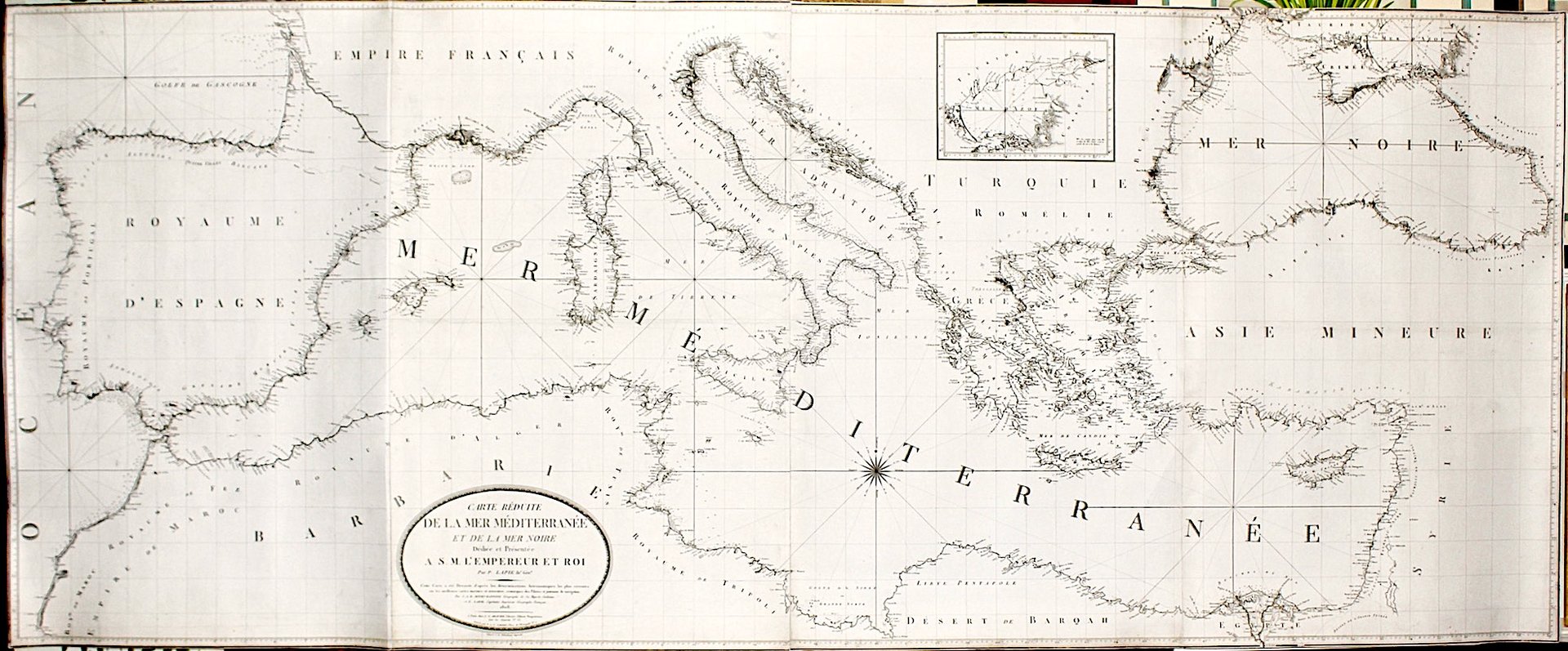 Incisione in rame di Pierre Antoine Francois Tardieu, cm 79x192, stampata in 4 lastre. Proiezione di Mercatore, longitudini dall'Isola di Ferro. Prima edizione dedicata a Napoleone "Empereur et Roi". Carta di notevole rarità basata su “les déterminations astronomiques les plus recentes, sur les meilleures cartes marines et terrestres, remarques des pilotes et journaux de navigation par J.A.B. Rizzi-Zannoni Géographe de Sa Majesté Sicilienne et P. Lapie Capitaine Ingénieur Géographe Français”. Lapie stesso scrive "Cette carte fut dressée en 1804, par Rizzi-Zannoni, géographe napolitain; je la recommençais en grande partie en 1808 et depuis métant procuré de nouveaux matériaux, je refis en 1813, Le Côtes de la Guyenne, celles de Portugal, le Golfe de Gênes, l'Illyrie et une partie de la Grèce, la Mer de Marmara, quelques points de l'Asie mineure, l'île de Chypre et enfin la majeure partie des Côtes de l'Afrique”. E' molto probabile che la carta sia stata realizzata sulla scorta della “Carta Piana del Mare Mediterraneo”, di Giovanni Fileti pilota maggiore della Real Marina Borbonica, pubblicata a Palermo in 11 fogli nel 1802, alla cui formazione il Rizzi Zannoni contribuì in maniera determinante con le sue memorie e la sua prestigiosa raccolta cartografica. Egli ricevette a tal proposito un ordine dal conte di Thurn, comandante della marina borbonica nel delicato periodo della rivoluzione napoletana del 1799. La carta fu quindi elaborata e rivista, soprattutto per le coordinate e per la proiezione, da Pierre Lapie e quindi incisa a Parigi dal Tardieu (1757-1822), nel 1808. La carta riscosse un certo favore e l'astronomo Xavier de Zach ne pubblicò una recensione nella sua famosa Monatliche Corresponden nel 1811. Ottimo esemplare ben conservato rifilato alla battuta del rame Pierre M. Lapie (fl. 1779 - 1850) fu un importante cartografo ed incisore francese attivo ad inizio Ottocento. Nacque a Mezieres nel 1771, morì nel 1850; nel 1814 diventò direttore del gabinetto topografico reale e dal 1818 direttore responsabile della nuova carta topografica di Francia; pubblicò un atlante classico nel 1812 ed uno moderno nel 1828.Bibl:A.A. V.V. (Associazione Roberto Almagià): La cartografia italiana in età napoleonica, 2022, pag. 204, scheda 93; De Zach 1800 - 1811 vol. 24, 127- 147; Valerio 1993: 215 N° 32