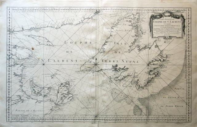 Carte réduite du Golphe de S.t Laurent. Contenant l'Isle de Terre – Neuve et Partie de la Coste Des Esquimaux, l'Isle Royale, L'isle S.t Jean et Celle D'Anticosti & ca. Dressée au dépost des Cartes Plans et Journaux de la Marine pour le Service des Vaisseaux du Roi par ordre de M. Rouillé.