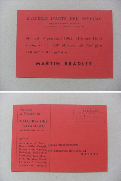 Cartolina / invito Mostra MARTIN BRADLEY. Galleria d´Arte del Naviglio di Carlo Cardazzo 1962