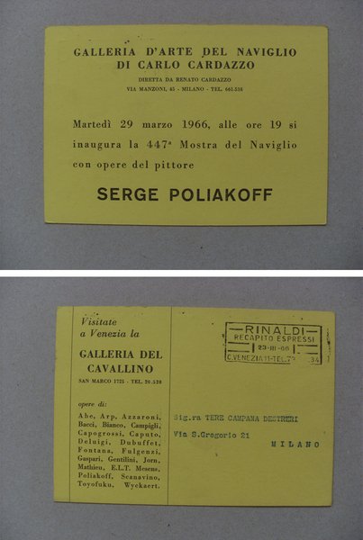 Cartolina / invito Mostra SERGE POLIAKOFF. Galleria d´Arte del Naviglio di Carlo Cardazzo 1966