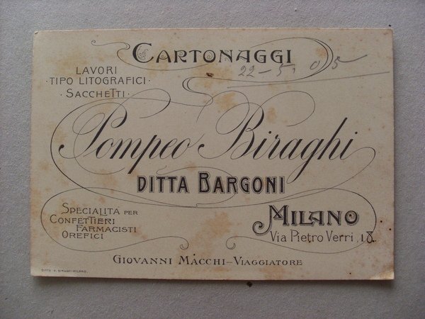 Cartoncino Cartonaggi POMPEO BIRAGHI Ditta Bargoni MILANO. Lavori tipo litografici, sacchetti. Primi'900
