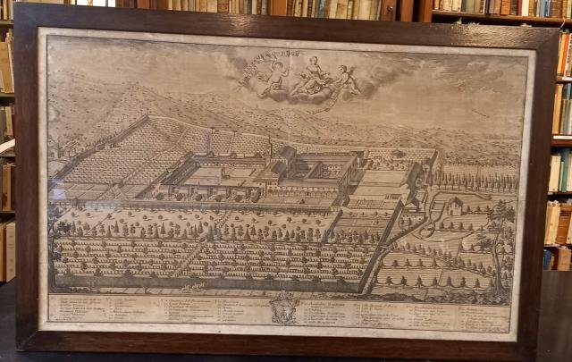 Prima edizione. Stupenda incisione celebrativa in formato orizzontale cm.56,5x92, con intelaiatura ottocentesca, in cornice moderna. Vi viene raffigurata l'abbazia dell'Ordine dei Certosini di Farneta, piccolo borgo ubicato a ovest di Lucca, in una sontuosa veduta prospettica, con immagine comprendente gli edifici monastici e le immediate vicinanze. Nella parte centrale superiore viene raffigurata la Vergine fra due putti alati, che sorreggono due festoni con l'intitolazione "Cartusiae Lucensis An.1338 fundatae" e "Monstra te esse Matrem". Sullo sfondo, nella parte superiore destra, compare una piccola suggestiva rappresentazione della città di Lucca e della sua cerchia muraria. Secondo l'usanza del tempo, ogni singola area viene contrassegnata da un numero, con al piede della tavola la relativa "legenda", spiegazione dettagliata, in lingua latina. Il n°1 corrisponde proprio alla "Civitas Lucensis, que distat iter horae unius ab hac Cartusia". Il n°2 indica il corso d'acqua che separa Lucca da Farneta, "Serchium Flumen". Dal n°3 al n°7 sono indicati gli edifici esterni o immediatamente adiacenti alla struttura abbaziale principale: n°3) Sacellum Nativitati B.M. dicatum; n°4) Hospitium Mulierum; n°5) Ianua Monasterij; n°6) Officinae diversae; n°7) Caella Ianitoris. Dal n°8 al n°48 sono segnalati i vari edifici e spazi all'interno della Certosa, con relative destinazioni d'uso: cortili, lavatoio, orti, fienile, chiostri, ospizio, dormitori, refettorio, atrii, chiese, cimitero, celle, cantina, corsi d'acqua, frutteti, fornace, frantoio, molino, etc. Le ultime due indicazioni connotano i dintorni dell'edificio, "Praedia, et nemora Monasterij" e la via principale d'accesso, "Via Major quae ducit ad Monasterium". Sullo sfondo si intravedono le sagome dei paesi di Stabbiano, San Macario in Monte e Vecoli. L'insieme è veramente armonioso, arricchito da alcune figure animate, quali carrozza, cavalieri, monaci, lavoratori. Nella parte centrale in basso, in cartiglio ornamentale, lo stemma dell'Ordine dei Certosini, sormontato dallo Spirito Santo, e l'indicazione dell'anno di stampa, 1771. Ai due angoli inferiori l'indicazione degli artisti autori della tavola: "Michele Pucci del[ineavit]" e "Ab. Gio[vanni] Canocchi incise". La carta è applicata su tela, con telaio rinforzato, e presenta una lieve brunitura uniforme, genuina e non invasiva, con tracce di minimi vecchi restauri ai margini. L'insieme, come detto, è di grande suggestione. Si tratta di una incisione originale di estrema rarità. Il bozzetto è di Michele Pucci, su cui non è stato possibile rintracciare notizie. L'incisione si deve all'abate Giovanni Canocchi, probabilmente toscano di nascita, o comunque molto attivo a Lucca e in Toscana nella seconda metà del XVIII secolo. Di lui si sa che fece parte, assieme a Nerici, Gregori, Iuman, Guidotti, Fambrini e altri, del gruppo di artisti che realizzò l'apparato iconografico della edizione lucchese della "Encyclopédie ou Dictionaire raisonné des sciences des arts libéraux, et des arts méchaniques avec leur explication", curata da Ottaviano Diodati a partire dal 1758, segnatamente realizzando tavole per le sezioni di Chirurgia, Coreografia, Scrittura, Carrozze, etc. Sono altresì molte le sue opere contenute in importanti pubblicazioni geo-topografiche del tempo: "Relazioni d'alcuni viaggi fatti in diverse parti della Toscana, per osservare le produzioni naturali, e gli antichi monumenti di essa" di Giovanni Targioni Tozzetti (1751-1754); "Delle case de' contadini: Trattato architettonico" di Ferdinando Morozzi (1770); "Dei Bagni di Montecatini" di Alessandro Bicchierai (1788); "Memorie idraulico - storiche sopra la Val di Chiana" di Vittorio Fossombroni (1789). Illustrò anche opere storiche e letterarie, sia con vedute che con ritratti, fra cui: "Dissertazioni sopra l'istoria pisana contenente l'origine della decadenza della Repubblica" di Flaminio Dal Borgo (1761-1768); "Opere" di Jacopo Riccati (1762); "Opere inedite in prosa e in verso" di Nicolò Machiavelli (1763); "De Rebus ad Velitras Gestis Anno 1744" di Catruccio Buonamici (1764); "Satire" di Salvator Rosa (1770 e edizioni successive); "Saggio istorico della Real Galleria di Firenze" di Giuseppe Bencivenni (1779); "Poesie toscane per la funesta morte di Maria Teresa imperatrice vedova regina d'Ungheria ." di Luigi Roverelli e Cosimo Giotti (1781). Sono noti anche alcuni ritratti di religiosi come Santa Verdiana, San Filippo Benizi, Santa Domenica, Maria Maddalena dei Pazzi, e carte quali "La Certosa di Galluzzo con Firenze sullo sfondo" (1754) e la "Carta topografica generale del lago di Castiglione e sue adiacenze fino alla radice dei Poggi" (1770). La carta riveste grande interesse storico perché è la prima rappresentazione grafica del monastero lucchese, consacrato nel 1358, dopo i rifacimenti della fine del XVII secolo. Nel XX secolo fu sede della "Grande Chartreuse", casa madre dell'Ordine Certosino, dal 1903 al 1940 ed è tristemente ricordata per l'irruzione delle truppe naziste del 2 settembre 1944, quando furono massacrati sei monaci, sei conversi e 32 civili. > Benezit, "Dictionnaire des Peintres, Sculpteurs, Dessinateurs et Graveurs", II, 295, (su Giovanni Canocchi) "Graveur du XVIII^ siècle. travailland à Florence. On cite de lui des planchespour le "Dizionario Enciclopedico"; Planche pour la "Bibliotheca teatrale" di Diodati, Pascal de Paoli". IV, 193. "Inventario del R. Archivio di Stato in Lucca ", IV, 525, "In fine si è aggiunta una grande prospettiva della Certosa, disegnata da Michele Pucci ed incisa in rame dall'abate Giovanni Canocchi, portante l'anno 1771, ed intitolata "Cartusiae Lucensis an.1338 fundatae". Codice libreria 163018.