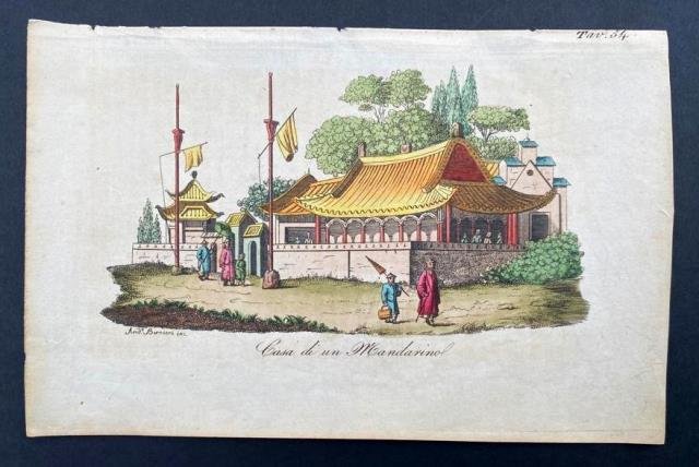 Tratta dal "Dizionario d’ogni mitologia e antichità” di Girolamo Pozzoli (Milano, Batelli e Fanfani, 1819 - 1827), incisione in rame all’acquaforte in colore d'epoca, cm 14,5 x 23 cm circa (il foglio), in basso a sinistra “Andrea Bernieri inc.”. Piacevole immagine che ritrae la casa di uno dei funzionari della Cina imperiale, il Mandarino. In piacevole coloritura coeva e in buono stato.