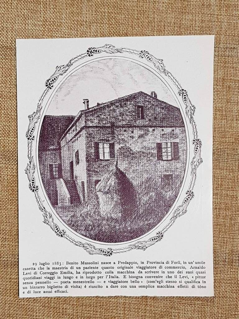 Rara stampa estratta da pubblicazione del 1932 Il 29 luglio 1883 nasce a Dovia di Predappio, in provincia di Forlì, Benito Mussolini, da Rosa Maltoni, maestra elementare, e Alessandro Mussolini, fabbro ferraio. La casa natale era una modesta abitazione, oggi divenuta luogo di memoria storica. Il passaggio che hai citato è un curioso omaggio al talento di Arnaldo Levi di Correggio Emilia, un viaggiatore di commercio che, con la sola macchina da scrivere, riusciva a riprodurre immagini — come la casa natale di Mussolini — usando caratteri tipografici per simulare toni e luci, una sorta di ASCII art ante litteram. Levi si definiva con ironia e creatività: “Pittor senza pennello, poeta menestrello e viaggiatore bello.” Questa forma di arte meccanica, oggi quasi dimenticata, era un esempio di ingegno artigianale e poetica visiva che univa la precisione della macchina alla fantasia dell’uomo. Dimensioni Cm 12,00 x 16,00 Codice prodotto: S.I. - 072 PayPal Carta di credito Bonifico bancario Inserita dentro plico di adeguate dimensioni per proteggerne l'integrità Spedizione con posta ordinaria o raccomandata scelta dall’Acquirente nel momento del pagamento Clicca qui per accedere al nostro Store ed al suo sterminato archivio