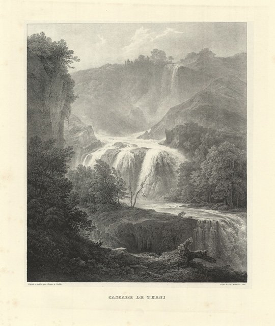 Importante veduta inserita nell’opera "Souvenirs de l’Italie, dediés à Sa Majesté la Reine Marie Isabelle de Bourbon, Infante d’Espagne, Mère de S. M. Ferdinand Second Roi du Royaume des Deux Siciles". La pubblicazione iniziò nel 1833, pratico esempio dell’attenzione al dato reale, tipica della scuola tedesca. Gli autori sono Muller Rudolf e Horner Friedrich e le stampe sono state prodotte dalla Litografia Reale di Napoli. Autore: Muller Rudolf & Horner Friedrich dis. e edit. Luogo: Terni - Cascata delle Marmore. Anno: 1833-36. Tecnica: litografia. Dimensioni: 410x350 mm