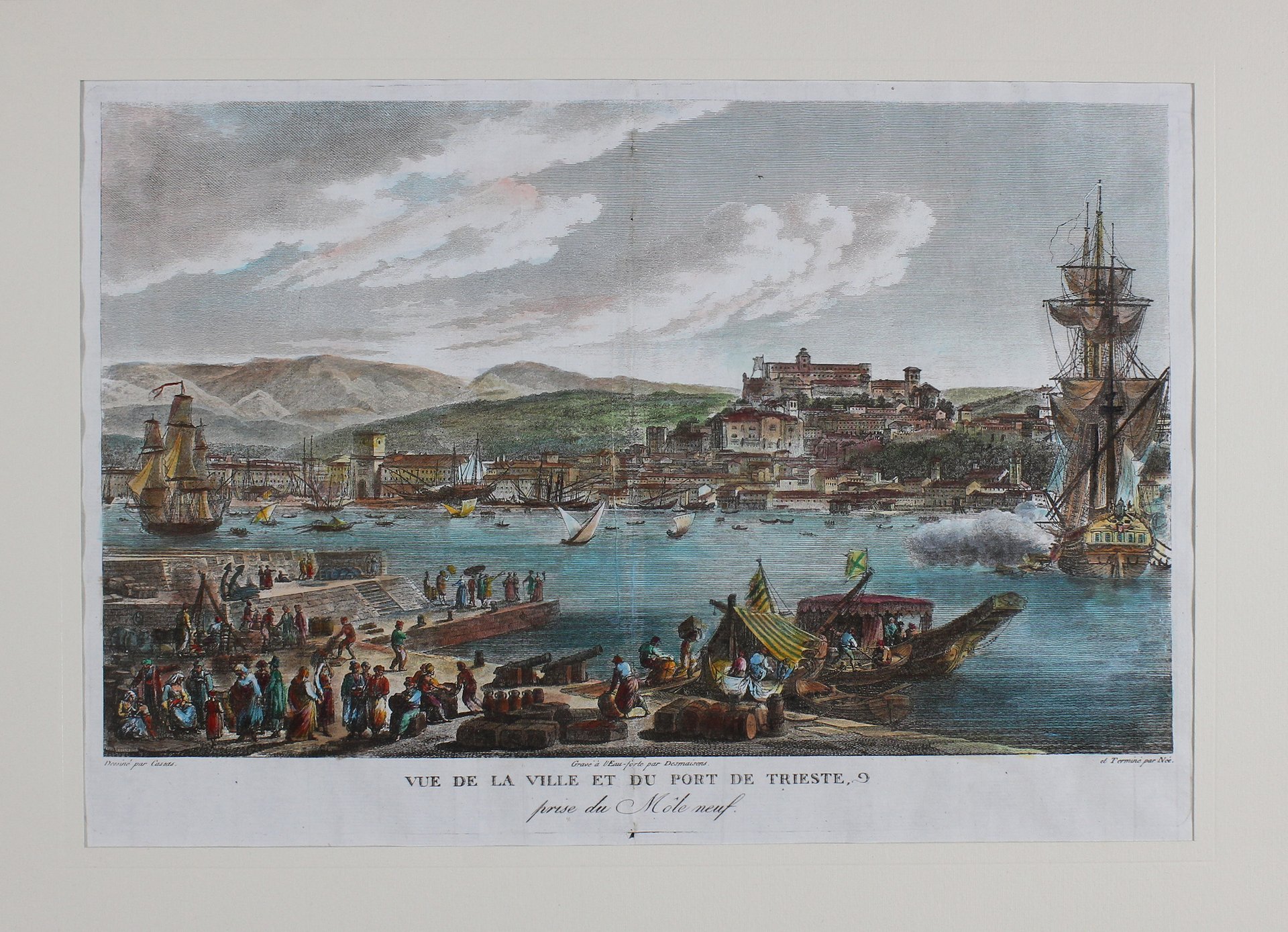 Veduta della città e del porto di Trieste animata da personaggi, presa dal molo nuovo, incisa all'acquaforte da Emile Desmaisons (1802-1880) da disegno di Louis Francois Cassas (1756-1827) e Francois Denis Née (1732-1817).