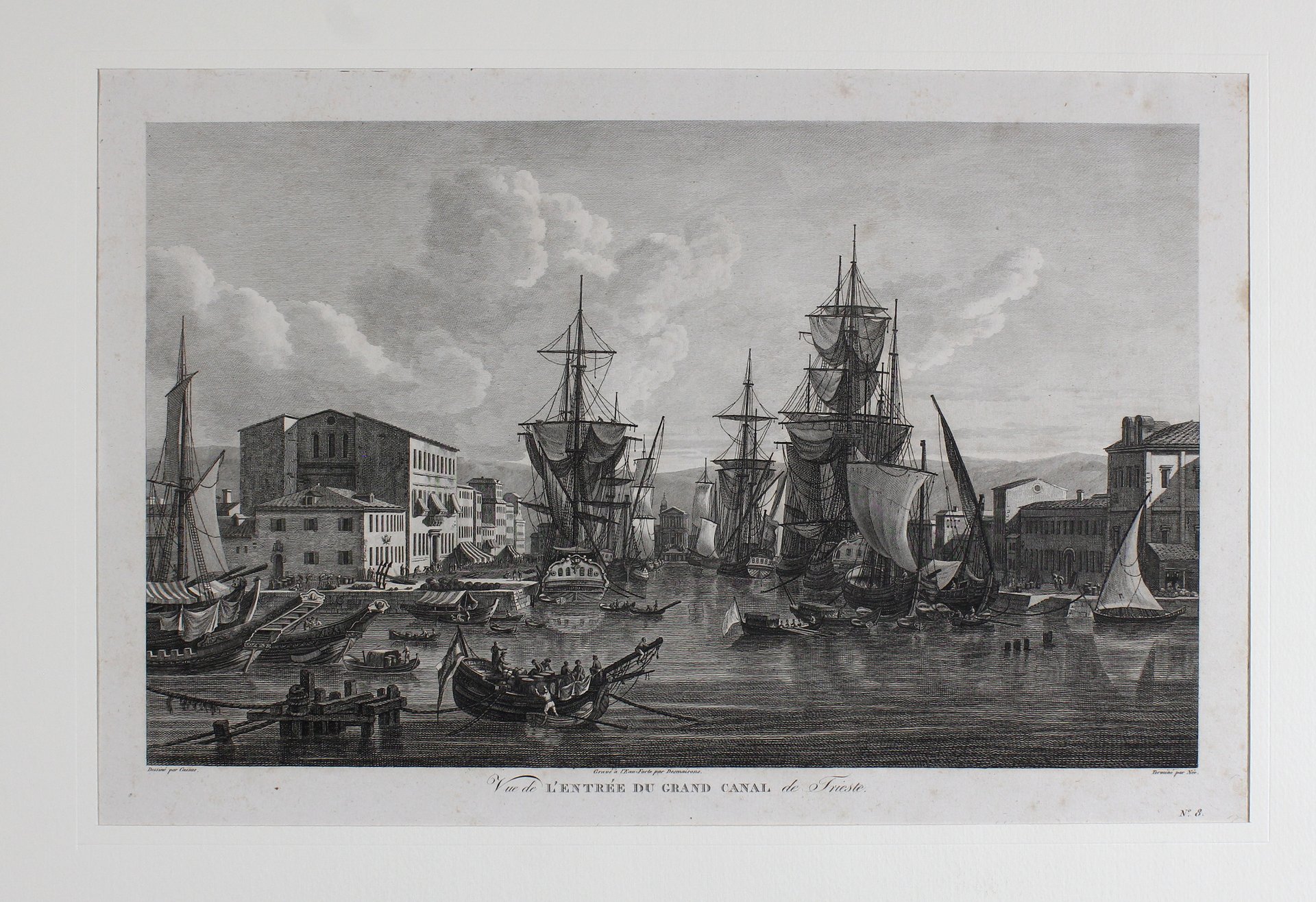 Louis Francois Cassas giunge a Trieste per la prima volta il pimo luglio 1782 per imbarcarsi subito dopo per la Dalmazia. Rientrato a Trieste l’artista si ferma in città per preparare i disegni delle tavole della sua opera più celebre: il "Voyage pittoresque et historique de l'Istrie et de la Dalmatie" da cui è tratta la presente stampa. Il lavoro di Cassas ebbe una grande influenza sugli artisti che giunsero dalla Francia a Trieste e che per tutto l'Ottocento ne immortalarono l'espansione e l'evoluzione.