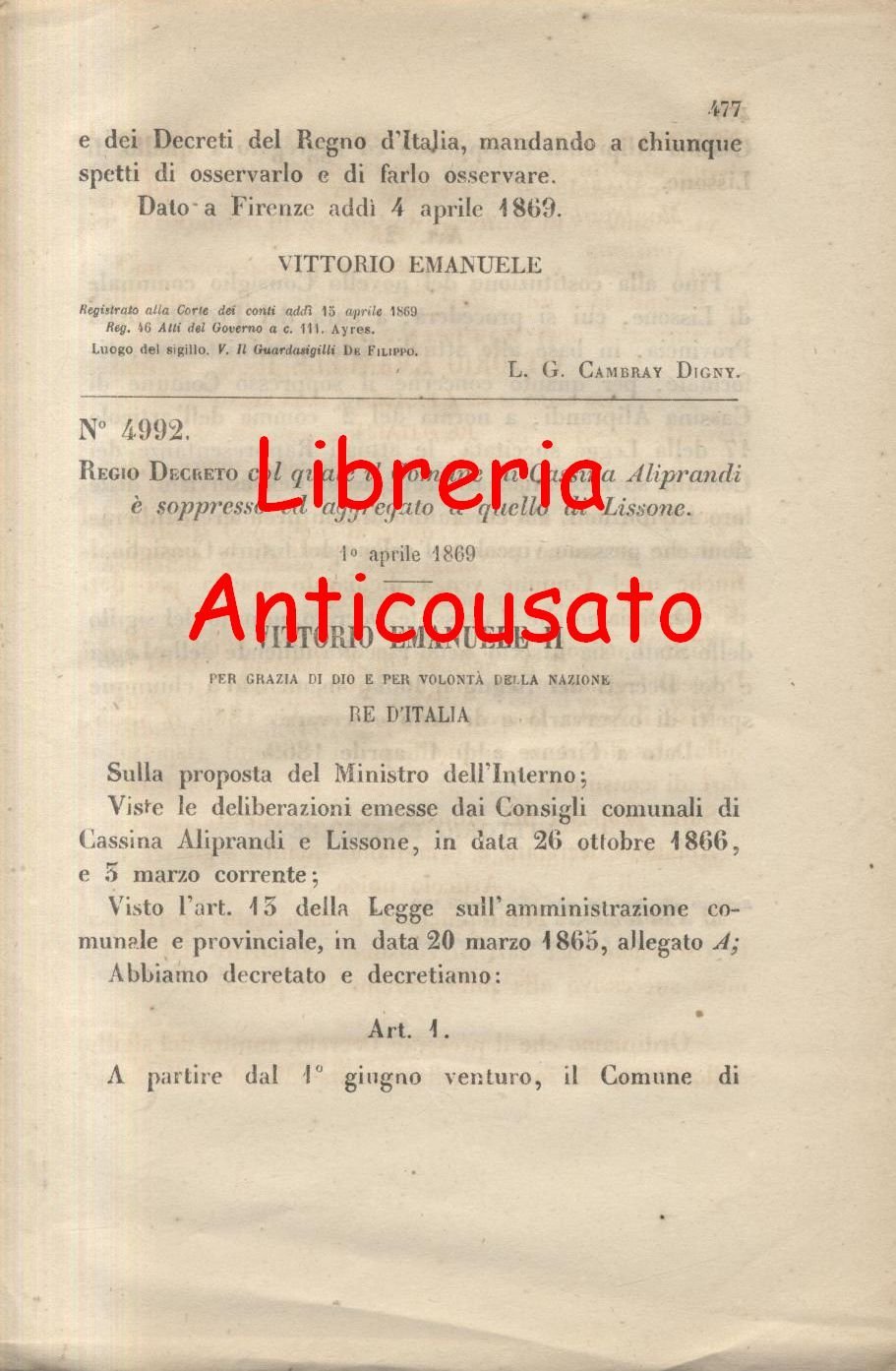 CASSINA ALIPRANDI SOPPRESSO Regio Decreto 1869 LISSONE originale d'epoca antico