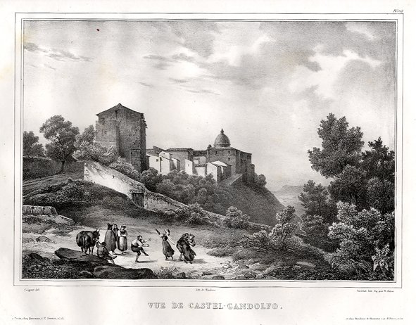 CASTEL CANDOLFO - "Vue de Castel-Gandolpho" Coignet del. - Jacottet lith. Ampio paesaggio con figure.
