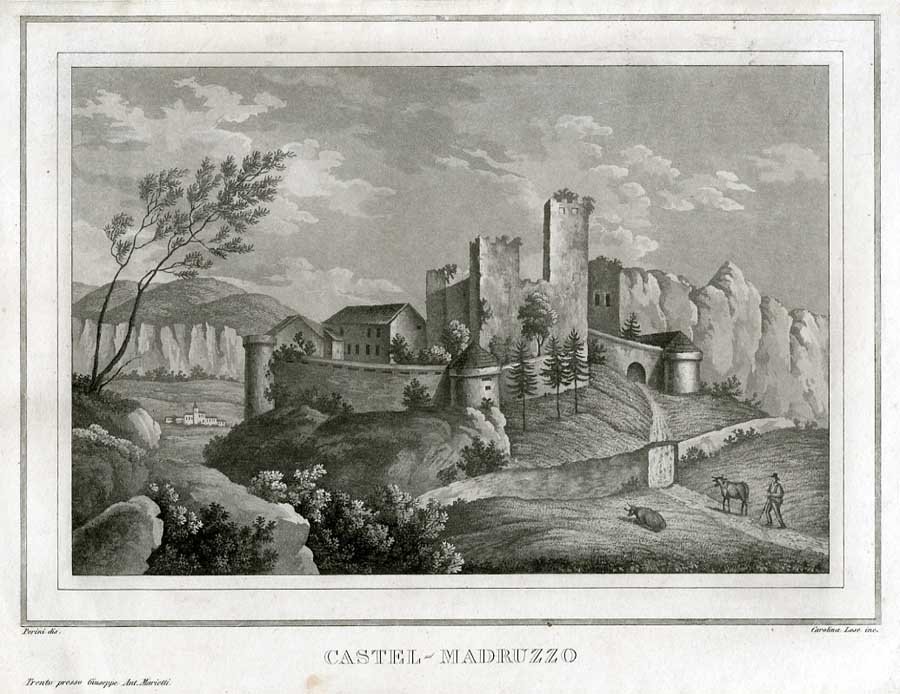 Litografia di dimensioni 155x230 mm. Condizioni : USATO - Stato : Buono, ordinari segni d'uso e del tempo. Altre note : Veduta di Castel Madruzzo sulla sommità del colle alle pendici del monte Bondone, con le due imponenti torri medievali Gumpone e Boninsegna. Incisa da C. Lose, si trova in "I castelli del Tirolo" di Agostino Perini. Scheda bibliografica tratta da "Trento illustrata: la città e il territorio in piante e vedute dal XVI al XX secolo" di Aldo Chemelli e Carlo e Marcus Perini, scheda n. 114. In cornice.