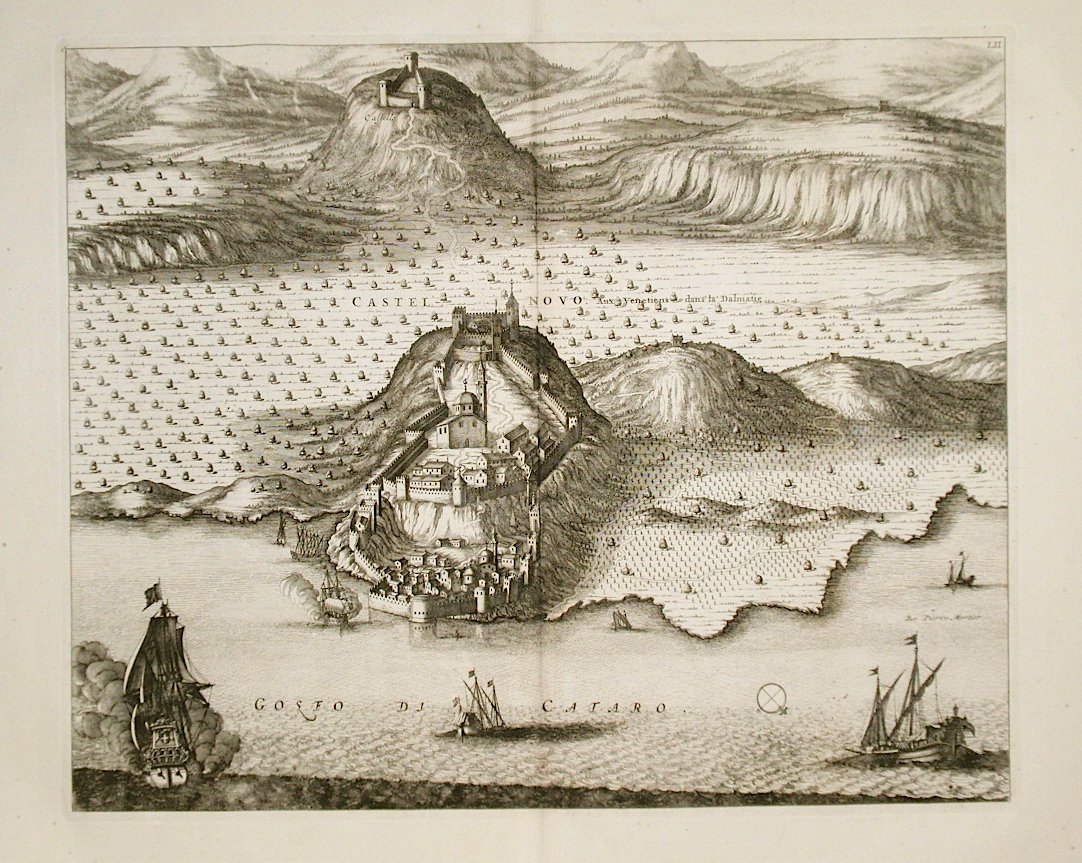 Incisione in rame, mm 425x515. Veduta prospettica della cittadina da due angolazioni diverse e pianta della fortezza. <BR>Mortier, editore attivo ad Amsterdam ad inizio '700, ristampò il "Theatrum Civitatum…Italiae" di Blaeu del 1663 aggiungendovi un quarto volume, relativo a nord Italia, Dalmazia, Grecia e Toscana. Da questa opera proponiamo le seguenti piante e vedute, tutte incise in rame.<BR>Bell'esemplare, piega editoriale, con ampi margini. <BR>