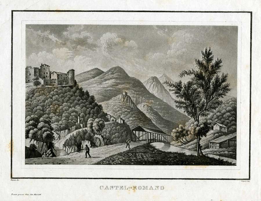Acquatinta di dimensioni 156x235 mm. Condizioni : USATO - Stato : Buono, ordinari segni d'uso e del tempo. Alcune bruniture. Altre note : Veduta di Castel Romano e della sottostante conca di Pieve di Bono, con il ponte sull'Adanà in primo piano. Si trova in "I castelli del Tirolo" di Agostino Perini. Incisa dal Citterio. Scheda bibliografica tratta da "Trento illustrata: la città e il territorio in piante e vedute dal XVI al XX secolo" di Aldo Chemelli e Carlo e Marcus Perini, scheda n. 125.