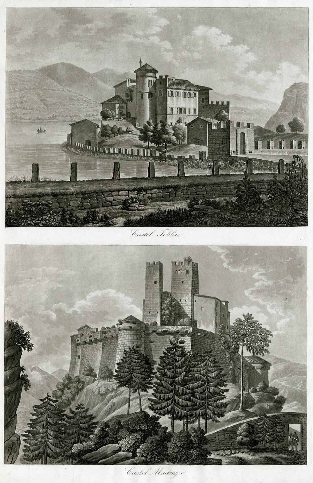 Litografia di dimensioni 418x275 mm. Condizioni : USATO - Stato : Buono, ordinari segni d'uso e del tempo. Altre note : I due noti castelli trentini, Castel Toblino e Castel Madruzzo, sono presentati in due vedute contenute in "Famiglie celebri italiane" di Pompeo Litta. Scheda bibliografica tratta da "Trento illustrata: la città e il territorio in piante e vedute dal XVI al XX secolo", di Aldo Chemelli e Carlo e Marcus Perini, scheda n. 113.