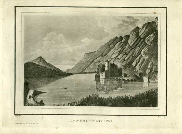 Litografia di dimensioni 162x247 mm. Condizioni : USATO - Stato : Buono, ordinari segni d'uso e del tempo. Altre note : Veduta di Castel Toblino. La stampa inserita in riquadro si trova in "I castelli del Tirolo colla storia delle relative antiche-potenti famiglie" di Agostino Perini ed è incisa da Francesco Citterio.