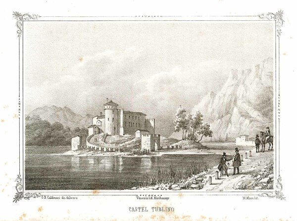 Stampa antica ed originale con graziosa veduta del Castel Toblino che affaccia sull'omonimo lago. Il castello si trova tra Padergnone e Sarche nel comune di Madruzzo. Leggeri segni di foxing lungo il margine inferiore.