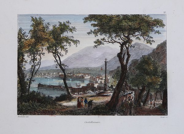 Veduta tratta dal celebre L'Italie, la Sicile, les Iles Éoliennes, l'Ile d'Elbe, la Sardaigne, Malte, l'Ile de Calypso etc. D'après les inspirations, les recherches et les travaux de M. M. le Vicomte de Chateaubriand, De Lamartine, Raoul-Rochette, le Comte de Forbin, Piranesi, Mazzara, et de Napoléon, Denon, Saint-Non, Lord Byron, Goethe, Visconti, Cicognara, Lanzi, de Bonstetten, Swinburne, etc. Sites, Monumens, Scènes et Costumes, d'après M.me Haudebourt-Lescot, MM. Horace-Vernet, Granet, Isabey, Ciceri, Mazzara, le Major Light, le Cap. Batty, Cooke, Gell et Gandy, Pinelli, Ferrari, Zucoli, et beaucoup d'autres artistes italiens. Recueillis et publiés par Audot Père, Membre de la Société de Géographie, edito a Parigi tra il 1834 ed il 1837 e ristampato a Torino [Giuseppe Pomba e Ca, 1834-1838]. L'opera, in cinque volumi, raccoglie scritti di autori vari, curati da Audot, ed è riccamente illustrata da 324 incisioni su acciaio fuori testo, molte delle quali con accostamento multiplo, per un totale di 473 tavole. Fu notoriamente mastodontico il lavoro cui si sottopose Louis Eustache Audot (1783-1870). ' Finemente colorata a mano. View taken from the famous L'Italie, la Sicile, les Iles Éoliennes, l'Ile d'Elbe, la Sardaigne, Malte, l'Ile de Calypso etc. D'après les inspirations, les recherches et les travaux de M. M. le Vicomte de Chateaubriand, De Lamartine, Raoul-Rochette, le Comte de Forbin, Piranesi, Mazzara, et de Napoléon, Denon, Saint-Non, Lord Byron, Goethe, Visconti, Cicognara, Lanzi, de Bonstetten, Swinburne, etc. Sites, Monumens, Scènes et Costumes, d'après M.me Haudebourt-Lescot, MM. Horace-Vernet, Granet, Isabey, Ciceri, Mazzara, le Major Light, le Capt. Batty, Cooke, Gell et Gandy, Pinelli, Ferrari, Zucoli, et beaucoup d'autres artistes italiens. Recueillis et publiés par Audot Père, Membre de la Société de Géographie, published in Paris between 1834 and 1837 and reprinted in Turin [Giuseppe Pomba e Ca, 1834-1838]. The work, in five volumes, collects the writings of various authors, edited by Audot, and is richly illustrated with 324 engravings on steel outside the text, many of them with multiple combinations, for a total of 473 tables. Louis Eustache Audot (1783-1870) was a notoriously mammoth task. ' Finely hand-colored. Cfr.