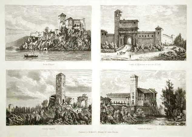 Veduta di quattro castelli della Lombardia: Rocca d'Angera, Macastorna, Baradello e Cassano. Testo al verso