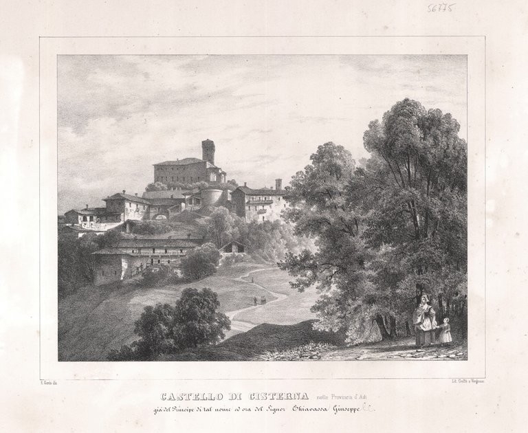 Stampa litografica, antica ed originale, del Castello di Cisterna d'Asti. Tratta da una delle più importanti raccolte iconografiche dei principali castelli del Piemonte e Valle d'Aosta, raffigurata da 200 tavole. L'opera "Album delle principali Castella feudali della Monarchia di Savoja" è edita a Torino presso Fontana e Isinardi Editori dal 1841 al 1860. La litografia è inserita nel fascicolo con brossura originale illustrata che riporta i titolo dell'opera e nr del fascicolo 30. Autore: Gonin Enrico dis. & Crette e Vargnano lit. Luogo: Cisterna d'Asti. Tecnica: litografia. Dimensioni: 257x340 mm