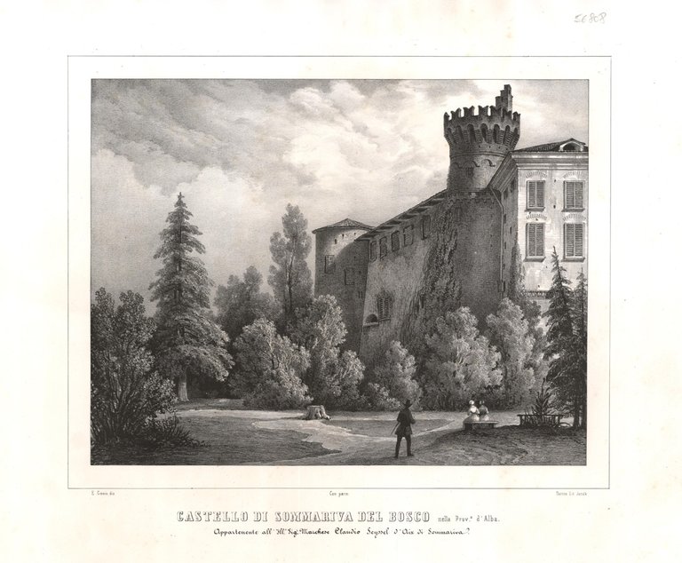 Stampa litografica, antica ed originale, del Castello di Sommariva del Bosco in provincia di Cuneo. Tratta da una delle più importanti raccolte iconografiche dei principali castelli del Piemonte e Valle d'Aosta, raffigurata da 200 tavole. L'opera "Album delle principali Castella feudali della Monarchia di Savoja" è edita a Torino presso Fontana e Isinardi Editori dal 1842 al 1860. La litografia è inserita nel fascicolo con brossura originale illustrata che riporta i titolo dell'opera e nr del fascicolo 63. Autore: Gonin Enrico dis. &. Luogo: Sommariva del Bosco CN. Anno: 1847. Tecnica: litografia. Dimensioni: 260x227 mm