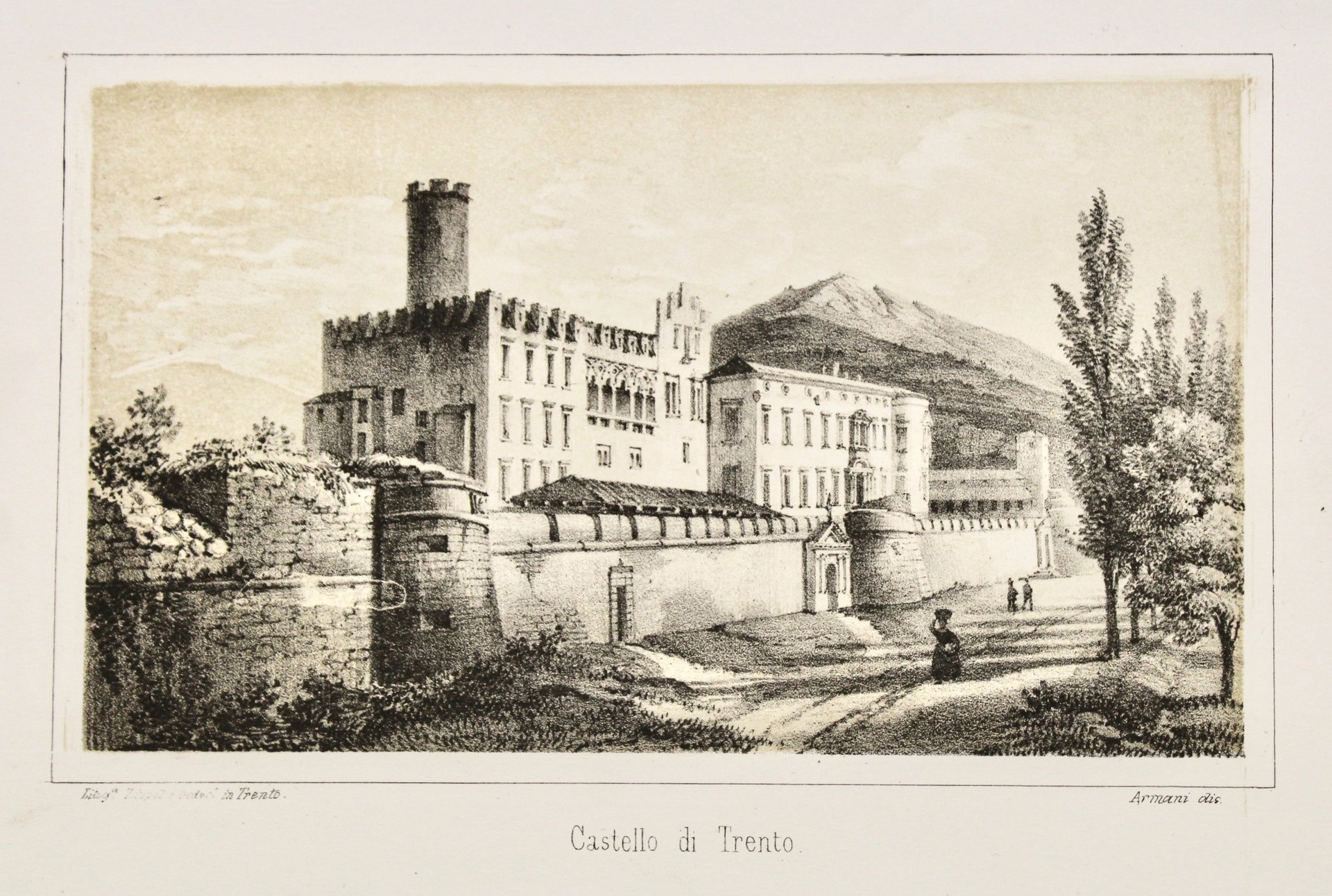 Litografia, mm 92x157 (immagine) tratta dalla rara serie pubblicata da Zippel e Godermaier. Basilio Armani (Riva del Garda 1817 – Malé 1899), fu pittore e incisore, reso celebre soprattutto dalle sue vedute litografiche di paesaggi gardesani, trentini e tirolesi. Ottimo esemplare assai marginoso.