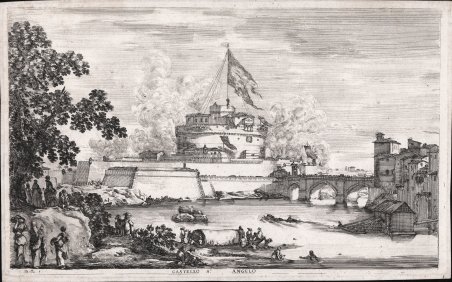 Veduta di Castel Sant'Angelo dalla riva sinistra del Tevere; a destra il ponte e a sinistra un gruppo di donne in piedi sotto un albero che guardano verso il castello al centro; da dietro il castello, su cui sventola una grande bandiera, si leva il fumo dei colpi di artiglieria. Acquaforte, 1634 circa, incisa nel margine sotto l'immagine con il titolo e con il dettaglio della produzione: "SDBella f." Stefano della Bella fu uno degli incisori più interessanti e originali nella Firenze del XVII secolo e può considerarsi l’unico geniale continuatore dell’opera di Jacques Callot. La sua educazione artistica ebbe inizio a Firenze nella bottega degli orafi Gasparo Mola e Orazio Vanni, e la precisione del segno, tipica dell’arte orafa resterà caratteristica del suo stile. Studiò poi presso Giovanni Battista Vanni e forse anche presso il Cantagallina e Cesare Dandini, ma ben presto si dedicò all'incisione. Il suo vero maestro può considerarsi Jacques Callot, l’incisore francese che soggiornò a lungo a Firenze lasciando una forte impronta nel panorama artistico della città. Gli anni più importanti della sua carriera sono quelli che trascorre a Parigi, dal 1639 al 1650, stipendiato da Lorenzo de' Medici: lavorò insieme ad Israel Silvestre, con gli editori Langlois, Ciartres e Pierre Mariette, per stampatori francesi e per commissioni di gran prestigio, come quelle del 1641 per il cardinale Richelieu che gli affidò le illustrazioni delle sue imprese guerresche. Intorno al 1647, durante un viaggio in Olanda, dove eseguì le acqueforti con le vedute del porto di Amsterdam, incontrò Rembrandt e da quella data notiamo una eco profonda dell’arte dell’olandese nella grafica del Della Bella. Bibliografia De Vesme - Massar Stefano della Bella (1971) n. 818. View of Castel Sant'Angelo from the left bank of the Tiber; with the bridge to right and a group of women standing under a tree to left looking back towards the castle at centre; smoke from artillery fire rises from behind the castle which is flying a large flag. Etching, 1634 circa, lettered in margin below image with title and with production detail: "SDBella f." Stefano della Bella was one of the most interesting and original engravers in 17th-century Florence and can be considered the only brilliant continuator of Jacques Callot's work. His artistic education began in Florence in the workshop of the goldsmiths Gasparo Mola and Orazio Vanni, and the precision of sign, typical of the goldsmith's art, will remain characteristic of his style. He then studied under Giovanni Battista Vanni and perhaps also under Cantagallina and Cesare Dandini, but soon turned to engraving. His real master can be considered Jacques Callot, the French engraver who stayed in Florence for a long time and left a strong imprint on the city's artistic scene. The most important years of his career were the ones he spent in Paris, from 1639 to 1650, salaried by Lorenzo de' Medici: he worked together with Israel Silvestre, with the publishers Langlois, Ciartres and Pierre Mariette, for French printers and for commissions of great prestige, such as those of 1641 for Cardinal Richelieu, who entrusted him with illustrations of his warlike exploits. Around 1647, during a trip to Holland, where he executed etchings with views of the port of Amsterdam, he met Rembrandt, and from that date we note a profound echo of the Dutchman's art in Della Bella's graphic work. Bibliografia De Vesme - Massar Stefano della Bella (1971) n. 818. Cfr.