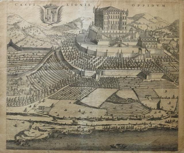 Amsterdam, 1726 circa. Dal “ Novum Theatrum Pedemontii et Sabaudiae, sive accurata descriptio ipsorum urbium, palatiorum, templorum” (seconda edizione del “Theatrum Sabaudiae”). Incisione in rame all’acquaforte, b/n, cm 52,8 x 61,2 (alla lastra) più margini. Titolo lungo il margine superiore, stemma in alto a sinistra; in basso, lungo la parte incisa “Eridanus Flu. Vulgo Il Po” e in basso, sulla destra, fuori dalla parte incisa, il numero di tavola, XLVIII. Intorno alla metà del XVII secolo, per il Ducato dei Savoia, attento al proprio ruolo politico, si imponeva la diffusione di un'immagine magnifica che solo un’opera editoriale di grandiose proporzioni avrebbe potuto assicurare: un libro figurato, ove immagini e testi risultassero reciproco completamento per la celebrazione della dinastia. Nasceva così, presso i Blaeu, intorno al 1661, il “Theatrum Statuum Regiae Celsitudinis Sabaudiae Ducis Pedemontii Principis Cypri Regis”, manifesto politico del Duca di Savoia e diretto a tutte le altri corti europee, opera che si sarebbe conclusa soltanto nel 1682. L'opera riproduceva grosso modo lo schema di precedenti imprese editoriali realizzate dai Blaeu (è chiaro il riferimento al "Teatro delle città principali delle Fiandre…”) e nei due volumi in folio di cui essa si compone, le incisioni fanno da testimonianza ed esaltazione alla grandezza del sovrano: nel primo tomo, alle antiporte, ritratti, dediche e carte geografiche, fanno seguito le vedute della città capitale, con le sue piazze, i suoi più insigni edifici civili e religiosi, le certose e le abbazie, i castelli e le altre strutture di difesa dello Stato, tutti attributi di decoro e magnificenza; seguono quindi le vedute delle principali città del ducato. Il secondo volume descrive le terre della Savoia, del Vercellese e del Monferrato, i monumenti storici e archeologici del ducato. Importante veduta del borgo di Castiglione Torinese dominato dal suo imponente castello, al margine inferiore il fiume Po animato da imbarcazioni. Il colle di Castiglione è una punta avanzata delle colline del Monferrato che si protende al centro della valle del Po: posizione ideale per un castello da cui dominare le terre circostanti e controllare l’intera piana fin dove si spinge lo sguardo. Tutto attorno si estende la valle col suo Rio Maggiore, lungo il quale correva una antica via romana che congiungeva la pianura fluviale torinese con la piana chierese. Tra la riva destra del Po e questa valle, nei secoli è cresciuto il paese di Castiglione che prese il nome dal vasto castello che dominava il borgo. Foglio con un uniforme ingiallimento e con alcuni piccoli strappi marginali, buono l’inciso.