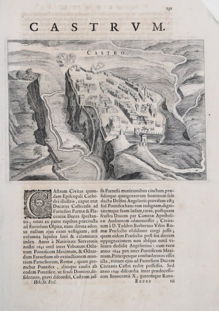 Opera tratta dalla rara prima edizione del ' Theatrum Civitatum et Admirandorum Italiae ad aevi veteris & praesentis temporis faciem expressum à Ioanne Blaeu G. F., ' stampata ad Amsterdam nel 1663. Si tratta del primo, monumentale, libro interamente dedicato alla cartografia urbana della sola penisola, preceduto dal “tascabile” ' Italia Hodierna ' di Jodocus Hondius del 1627 e realizzato in probabile concorrenza con Johannes Janssonius che, nel 1657, aveva pubblicato il ' Theatrum praecipuarum urbium, contenente un volume dedicato all’Italia. Johannes Blaeu, durante la sua lunga attività editoriale pubblica tre volumi sulle città italiane. Nel 1663 i primi tre, suddivisi in Stato della Chiesa, Roma e Regno di Napoli e Sicilia. Alla sua morte i suoi eredi danno alla luce altri due volumi datati 1682 incentrati sulle città del Piemonte e della Savoia, poi ristampati da altri editori nel 1693 e 1697. Il francese Pierre Mortier pubblica una ristampa nel 1704/5, intitolata ' Nouveau Theatre de l’Italie. ' L’opera è in quattro volumi e comprende le lastre del Blaeu, ritoccate e modificate in piccola parte, integrate dall’aggiunta di numerose nuove mappe di proprio disegno, raffiguranti le città della parte settentrionale della penisola, racchiuse nel primo volume dell’opera. L’atlante del Mortier venne pubblicato con testo latino, francese ed olandese. Il grande successo dell’opera diede origine ad un’ulteriore ristampa, praticamente identica, curata da Alberts ed edita nel 1724/5. Esemplare con testo descrittivo, della prima edizione del 1663. Map taken form the rare first edition of ' Theatrum Civitatum et Admirandorum Italiae ad aevi veteris & praesentis temporis faciem expressum à Ioanne Blaeu G. F., ' printed by Johannes Blaeu, Amsterdam, 1663. This is the first monumental town book entirely covering Italy, preceded by the "pocket-size" ' Italia Hodierna ' by Jodocus Hondius jr. (1627) and realized in likely competition with Johannes Janssonius who, in 1657, published the ' Theatrum praecipuarum urbium, ' containing a volume dedicated to Italy. Johannes Blaeu, during his long editorial activity published three volumes on Italian cities. In 1663 the first three, divided into the State of the Church, Rome and the Kingdom of Naples and Sicily. At his death his heirs gave birth to two more volumes dated 1682 focused on the cities of Piedmont and Savoy, then reprinted by other publishers in 1693 and 1697. Pierre Mortier publishes a reprint in 1704/5, entitled ' Nouveau Theatre de l'Italie. The work is in four volumes and includes the plates of Blaeu, retouched and modified in small part, supplemented by the addition of several new maps of his own design, depicting the cities of the northern part of the peninsula, enclosed in the first volume of the work. Mortier's atlas was published with Latin, French and Dutch texts. The great success of the work gave rise to a further reprint, virtually identical, edited by R. Alberts and published in 1724/5. Example of the first edition, showing descriptive text. Cfr.