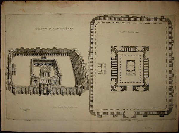 Incisione originale su rame (cm. 52x32,5 più margini bianchi). Carta vergellata con filigrana. Tenue alone circoscritto al margine superiore bianco, altrimenti esemplare in ottimo stato di conservazione. Imprint nella parte inferiore della lastra: ‘Bolognini. Zalterij formis. Venetiis Donati Rascicotti formis. 1597’. Copia dell’edizione lafreriana del 1553 pubblicata prima da Bolognino Zaltieri, poi dal Rascicotti. Ricostruzione e pianta dei ‘castra praetoria’, le caserme della guardia pretoriana fatte costruire per volontà dell’Imperatore Tiberio nel 23 d.C. tra il Viminale e l’Esquilino. Antoine Lafrery (Antonio Lafreri nella forma italianizzata), incisore, editore e mercante di stampe curò la pubblicazione tra il 1544 ed il 1575 di una serie di circa 200 incisioni - raffiguranti perlopiù monumenti ed antichità romane ed opera di diversi autori - nota come ‘Speculum Romanae Magnificentiae’. Le stampe erano poste in vendita sia singolarmente che sotto forma di raccolta con un numero spesso variabile di fogli. Dal 1574 iniziò a circolare anche una tavola-frontespizio dello ‘Speculum’, attribuita a Etienne Duperac. Successivamente, tra il tardo Cinquecento ed il Settecento, i rami lafreriani conobbero tirature posteriori con l’imprint di vari editori ed il contributo di diversi incisori. Inoltre lo ‘Speculum’ fu ampliato nel tempo mediante l’aggiunta di altre tavole il cui minimo comune denominatore appare quello di riprodurre opere antiche e moderne di Roma.
