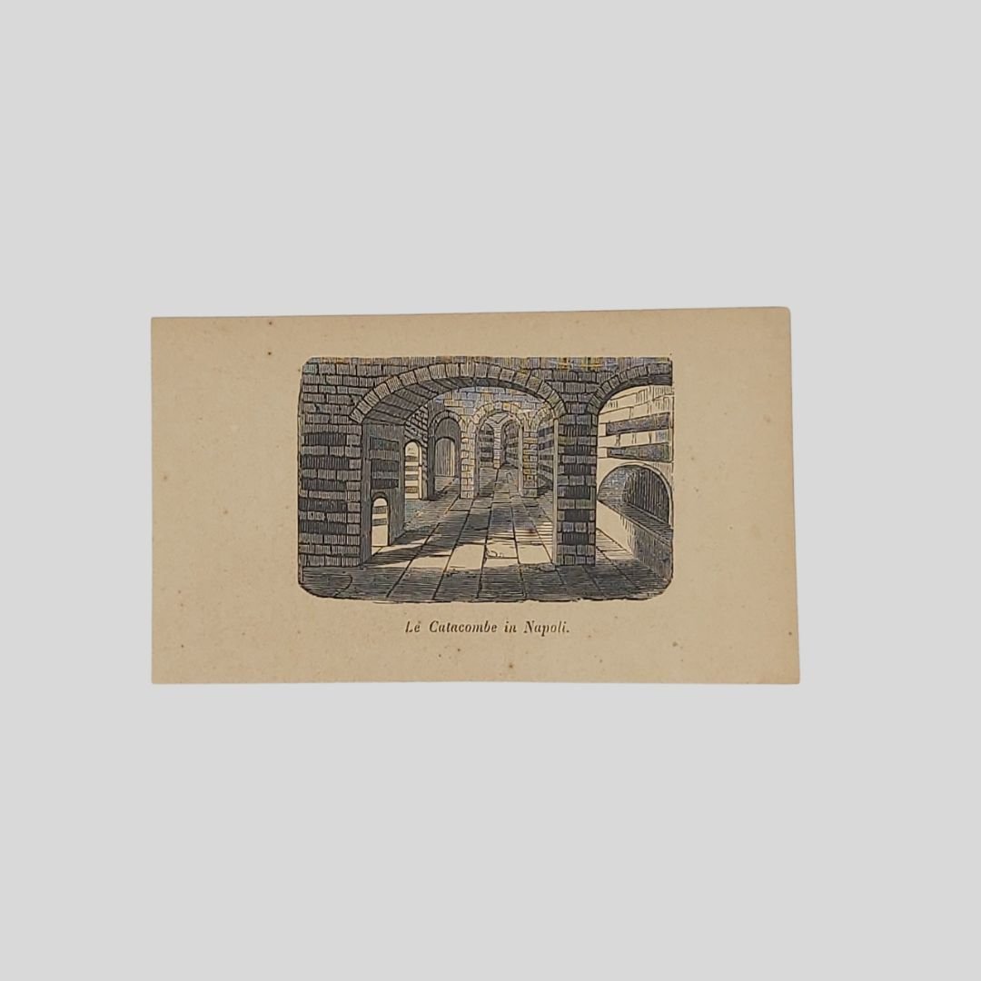 Xilografia. 1859, mm 85×55 (alla battuta), mm 145×85 (tavola). In buone condizioni. Vedutina delle attuali Catacombe di San Gennaro. Tratta da: Usi e costumi di tutti i popoli dell’universo. Milano, Borroni e Scotti (poi Libreria di F. Sanvito), 1856-1862.