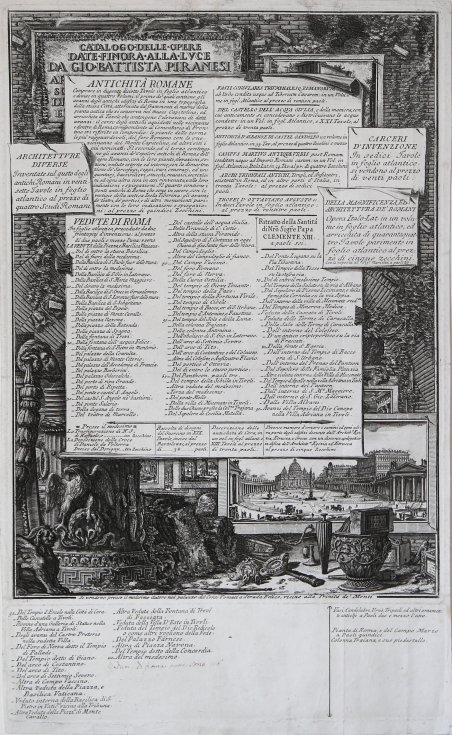 Acquaforte e bulino, circa 1773, firmata in lastra in alto a sinistra. Esemplare corrispondente al ventiduesimo stato di trentasei descritto dal recentissimo saggio di Andrew Robison (marzo 2022), databile all’autunno del 1773. Sono elencate 110 Vedute di Roma e, in basso a destra, la “Pianta di Roma e del Campo Marzo a Paoli quindici” e la “Colonna Traiana e suo piedistallo”. Iscrizione a penna – probabilmente autografa – in basso a sinistra: “Vedute di Roma tutte sono 116”. Il successivo catalogo del Piranesi, il ventitreesimo stato descritto da Robison, vede l’aggiunta di ulteriori 6 Vedute di Roma, portando appunto il numero delle opere offerte per la vendita a 116. Magnifica prova, impressa su carta vergata coeva priva di filigrana, con sottili margini, piccolo restauro all’angolo inferiore sinistro, tracce di pieghe di carta al verso, per il resto in buono stato di conservazione. Abitudine comune di molti editori nel diciottesimo secolo era quella di redigere e dare alle stampe cataloghi o listini prezzi delle opere grafiche che offrivano in vendita, allo scopo pubblicitario di promulgarle, facilitarne le ordinazioni, ricevere sottoscrizioni. Il Piranesi non si limitò ad un semplice catalogo scritto, realizzandone uno illustrato, meglio conosciuto come catalogo inciso, che pubblicò per la prima volta nel 1761. L’occasione fu quella della nuova sede di Palazzo Tomati, dove andò a stabilirsi proprio nel 1761. Il primo catalogo conteneva l’elenco delle 59 vedute della serie ' Vedute di Roma ' prodotte sino ad allora, comprendendo anche la lista dei libri e delle altre stampe realizzate; tale catalogo venne di volta in volta aggiornato con l’aggiunta del nuovo materiale in vendita, producendo un notevole numero di stati differenti, di cui ben 36 sono ora noti. Il catalogo inciso costituisce un elemento fondamentale per la datazione delle opere del Piranesi, strumento insostituibile di studio e ricerca, la cui analisi degli stati permette di datare approssimativamente tutte le opere tarde dell’artista. Nella realizzazione di questa opera, che a ragione viene considerata come l’ennesimo capolavoro, il Piranesi studia soprattutto l’aspetto decorativo che la stessa doveva assumere. La tecnica usata è la stessa di quella che ritroviamo in alcuni suoi libri; su uno sfondo architettonico egli dà vita ad un effetto ' trompe oeil, disegnando degli spilli che fermano alcuni cartigli contenenti titoli delle sue opere. Il primo piano è costituito da rovine e frammenti scultorei, mentre lo spazio bianco è volutamente inserito per aggiungere in seguito altre voci. Gli esemplari del catalogo sono notevolmente più rari delle altre incisioni, probabilmente sia per la scarsa tiratura, sia perché considerati effimero materiale pubblicitario, e quindi non conservati. Robison descrive solo tre esemplari del Catalogo in questa tiratura. Opera rarissima. Bibliografia Andrew Robison, ' Piranesi’s Catalogo delle Opere, in The Burlington Magazine, n. 164 (2022), pp. 230-245, XXII/XXXVI; H. Focillon, ' Giovan Battista Piranesi 1720-1778 ' (1918): n. 1; A. M. Hind, ' Giovanni Battista Piranesi. ' A critical study with a list of his published works and detailed catalogues of the Prisons and Views of Rome ' (1922): p. 6; ' cfr. K. Meyer-Haunton in ' Piranesi, Incisioni, Rami, Legature, Architetture. Etching and engraving, circa 1773, signed in plate top left. Example corresponding to the twenty-second state of thirty-six described by Andrew Robison's very recent essay (March 2022) dated to the fall of 1773. Listed are 110 Vedute di Roma and, at lower right, the Pianta di Roma e del Campo Marzo a Paoli quindici and Colonna Traiana e suo piedistallo. Ink inscription - probably autograph - at lower left: “Vedute di Roma tutte sono 116”. The subsequent Piranesi catalog, the twenty-third state described by Robison, sees the addition of 6 more Vedute di Roma, bringing precisely the number of works offered for sale to 116, Magnificent proof, printed on contemporary laid paper without watermark, with thin margins, small restoration to lower left corner, traces of paper creases on verso, otherwise in good condition. A common custom among many editors in the eighteenth century was to compile and print catalogues or price lists of the graphic works they sold with the promotional intent of advertising them, uphold orders and obtain subscriptions. Piranesi did not limit himself to a common written catalogue but even published an illustrated one, better known as the engraved catalogue, which he issued for the first time in 1761. This happened in the circumstance of his moving to new premises at the Tomati Palace. The first catalogue included the list of the fifty-nine views belonging to the collection ' Vedute di Roma, which he had created up to then, together with an inventory of other published books that featured his prints. This catalogue was constantly updated by adding new items that were put on sale, giving rise to a number of different states, of which 36 are currently known. The engraved catalogue is of primary importance for the dating of Piranesi's works, an essential means of study and research as the analysis of its states allows the approximate chronological classification of all of the artist's later works. When creating this work, which is correctly considered as another of his masterpieces, Piranesi focused his studies on its decorative aspects. He used the same technique that can be found in some of his books, creating a trompe-l'oeil effect on an architectural background, depicting pins which seemed to fasten a number of cartouches with titles pertaining to his works. The foreground consisted of ruins and sculptural fragments while an additional white space was included on purpose to allow for the addition of new items in the future. The items included in this catalogue are considerably rarer than Piranesi's other engraving, probably because they were printed in