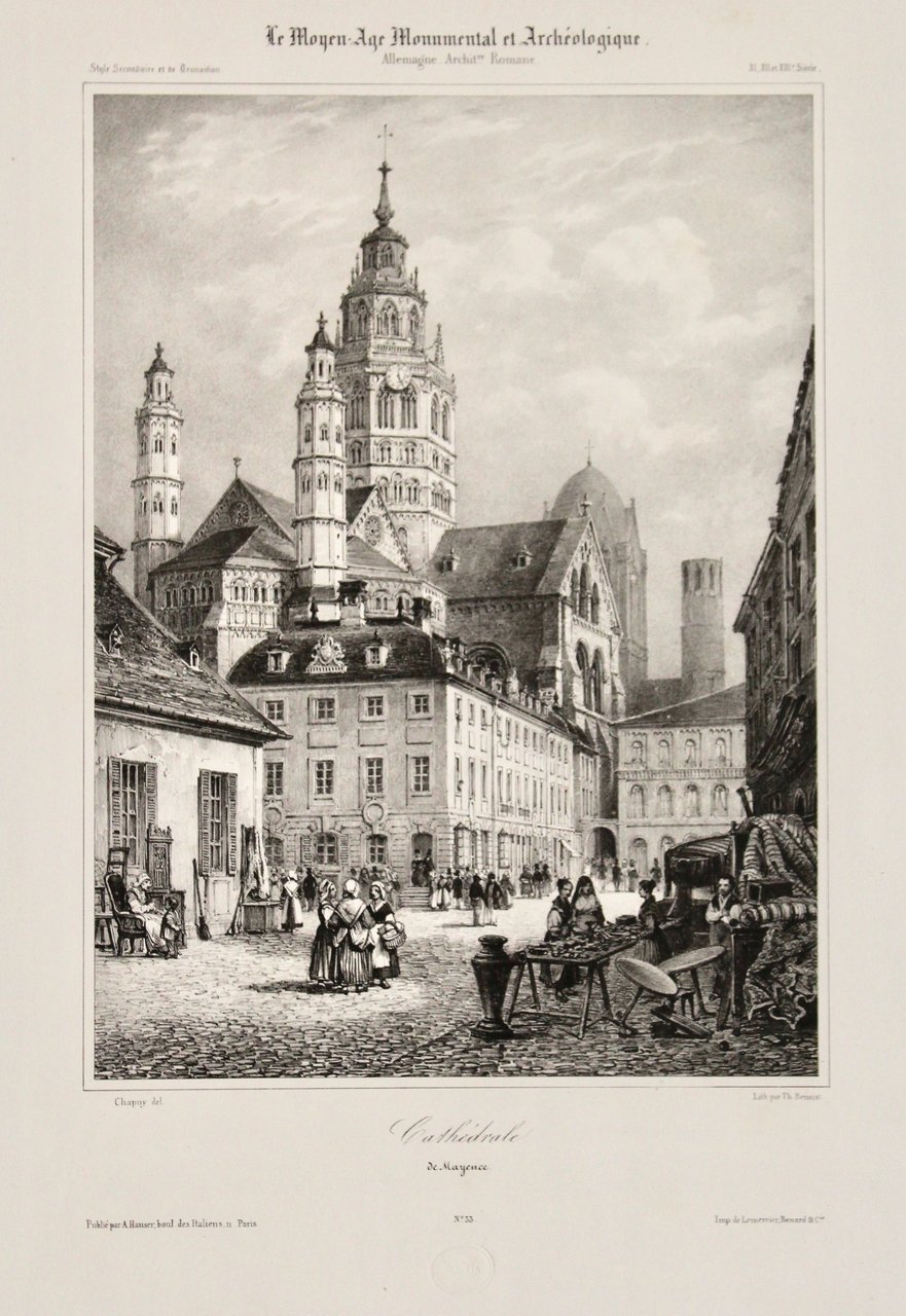 Litografia, mm 256x190 su foglio di mm 435x290; in basso a sinistra: "Chapuy del./Paris pubblié par A. Hauser boul. des Italiens, 11; in basso a destra: "lith. Par Th. Benoist/Imp. Lemercier Bernard et C". Magnifica veduta della piazza e della Cattedrale. Tratta da una corposa raccolta di vedute dal titolo "Le Moyen Monumental et Archéologique" eseguita su proprio disegno da Chapuy e litografata da A. Guesdon. Bell'esemplare. Timbrino editoriale a secco in basso sotto il titolo. Chapuy architetto del Corpo di Genio francese a causa del suo bonapartismo, dopo il 1815 dovette orientarsi verso una nuova attività. Grazie alle sue abilità grafiche-artistiche si dedicò alle illustrazioni di paesaggi e monumenti, lavorando su commissione dapprima per editori che legati al campo dell'archeologiae, dopo il 1823 alle pubblicazioni per i libri di viaggio. <BR>