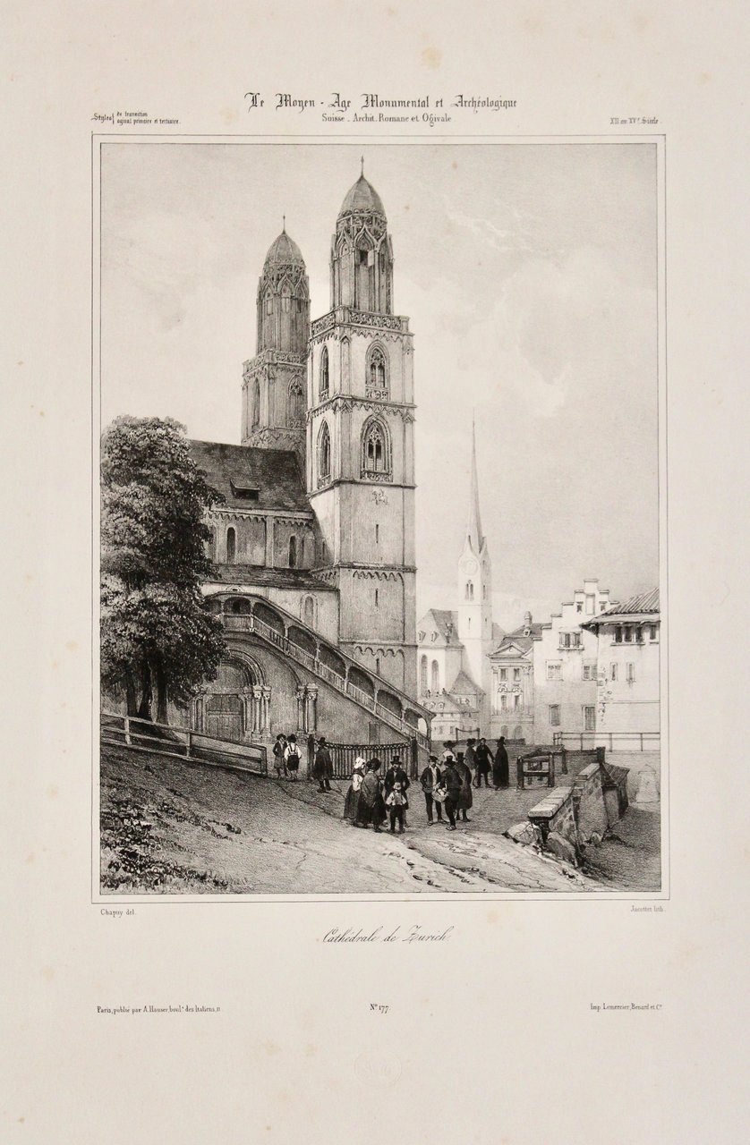 Litografia, mm 260x195 su foglio di mm 435x290; in basso a sinistra: "Chapuy del./Paris pubblié par A. Hauser boul. des Italiens, 11; in basso a destra: "Jacottet lith. / Imp. Lemercier Bernard et C". Bella veduta dell'imponente Cattedrale di Zurigo.<BR>Tratta da una corposa raccolta di vedute dal titolo "Le Moyen Monumental et Archéologique" eseguita su proprio disegno da Chapuy e litografata da A. Guesdon. Bell'esemplare. Timbrino editoriale a secco in basso sotto il titolo. Chapuy architetto del Corpo di Genio francese a causa del suo bonapartismo, dopo il 1815 dovette orientarsi verso una nuova attività. Grazie alle sue abilità grafiche-artistiche si dedicò alle illustrazioni di paesaggi e monumenti, lavorando su commissione dapprima per editori che legati al campo dell'archeologiae, dopo il 1823 alle pubblicazioni per i libri di viaggio. <BR><BR>