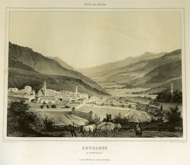 Litografia di dimensioni 217x295 mm. Condizioni : USATO - Stato : Buono. Altre note : Veduta di Cavalese in Val di Fiemme, con scena di lavori nei campi in primo piano. Sullo sfondo la catena del Lagorai, l'Alpe di Cermìs e di Lavazé. Scheda bibliografica tratta da "Basilio Armani: panorami dal Garda al Tirolo" a cura di Marina Botteri Ottaviani, scheda n. 66.