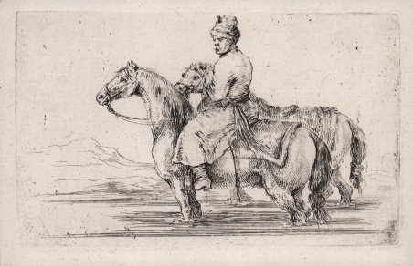 Stalliere polacco che porta due cavalli a fare il bagno; lo stalliere seduto su un cavallo con un altro cavallo dietro, entrambi di profilo verso sinistra e in piedi in un fiume. ' Acquaforte, 1662 circa, stampata su carta vergata coeva, con margini, ottimo stato di conservazione. Stefano della Bella fu uno degli incisori più interessanti e originali nella Firenze del XVII secolo e può considerarsi l’unico geniale continuatore dell’opera di Jacques Callot. La sua educazione artistica ebbe inizio a Firenze nella bottega degli orafi Gasparo Mola e Orazio Vanni, e la precisione del segno, tipica dell’arte orafa resterà caratteristica del suo stile. Studiò poi presso Giovanni Battista Vanni e forse anche presso il Cantagallina e Cesare Dandini, ma ben presto si dedicò all'incisione. Il suo vero maestro può considerarsi Jacques Callot, l’incisore francese che soggiornò a lungo a Firenze lasciando una forte impronta nel panorama artistico della città. Gli anni più importanti della sua carriera sono quelli che trascorre a Parigi, dal 1639 al 1650, stipendiato da Lorenzo de' Medici: lavorò insieme ad Israel Silvestre, con gli editori Langlois, Ciartres e Pierre Mariette, per stampatori francesi e per commissioni di gran prestigio, come quelle del 1641 per il cardinale Richelieu che gli affidò le illustrazioni delle sue imprese guerresche. Intorno al 1647, durante un viaggio in Olanda, dove eseguì le acqueforti con le vedute del porto di Amsterdam, incontrò Rembrandt e da quella data notiamo una eco profonda dell’arte dell’olandese nella grafica del Della Bella. Bibliografia De Vesme/Massar 1971 / Stefano della Bella (290). Polish groom taking two horses to bathe; the groom seated on a horse with another horse behind, both in profile facing left and standing in a river. Etching, circa 1662, printed on contemporary laid paper, with margins, very good condition. Stefano della Bella was one of the most interesting and original engravers in 17th-century Florence and can be considered the only brilliant continuator of Jacques Callot's work. His artistic education began in Florence in the workshop of the goldsmiths Gasparo Mola and Orazio Vanni, and the precision of sign, typical of the goldsmith's art, will remain characteristic of his style. He then studied under Giovanni Battista Vanni and perhaps also under Cantagallina and Cesare Dandini, but soon turned to engraving. His real master can be considered Jacques Callot, the French engraver who stayed in Florence for a long time and left a strong imprint on the city's artistic scene. The most important years of his career were the ones he spent in Paris, from 1639 to 1650, salaried by Lorenzo de' Medici: he worked together with Israel Silvestre, with the publishers Langlois, Ciartres and Pierre Mariette, for French printers and for commissions of great prestige, such as those of 1641 for Cardinal Richelieu, who entrusted him with illustrations of his warlike exploits. Around 1647, during a trip to Holland, where he executed etchings with views of the port of Amsterdam, he met Rembrandt, and from that date we note a profound echo of the Dutchman's art in Della Bella's graphic work. Bibliografia De Vesme/Massar 1971 / Stefano della Bella (290). Cfr.