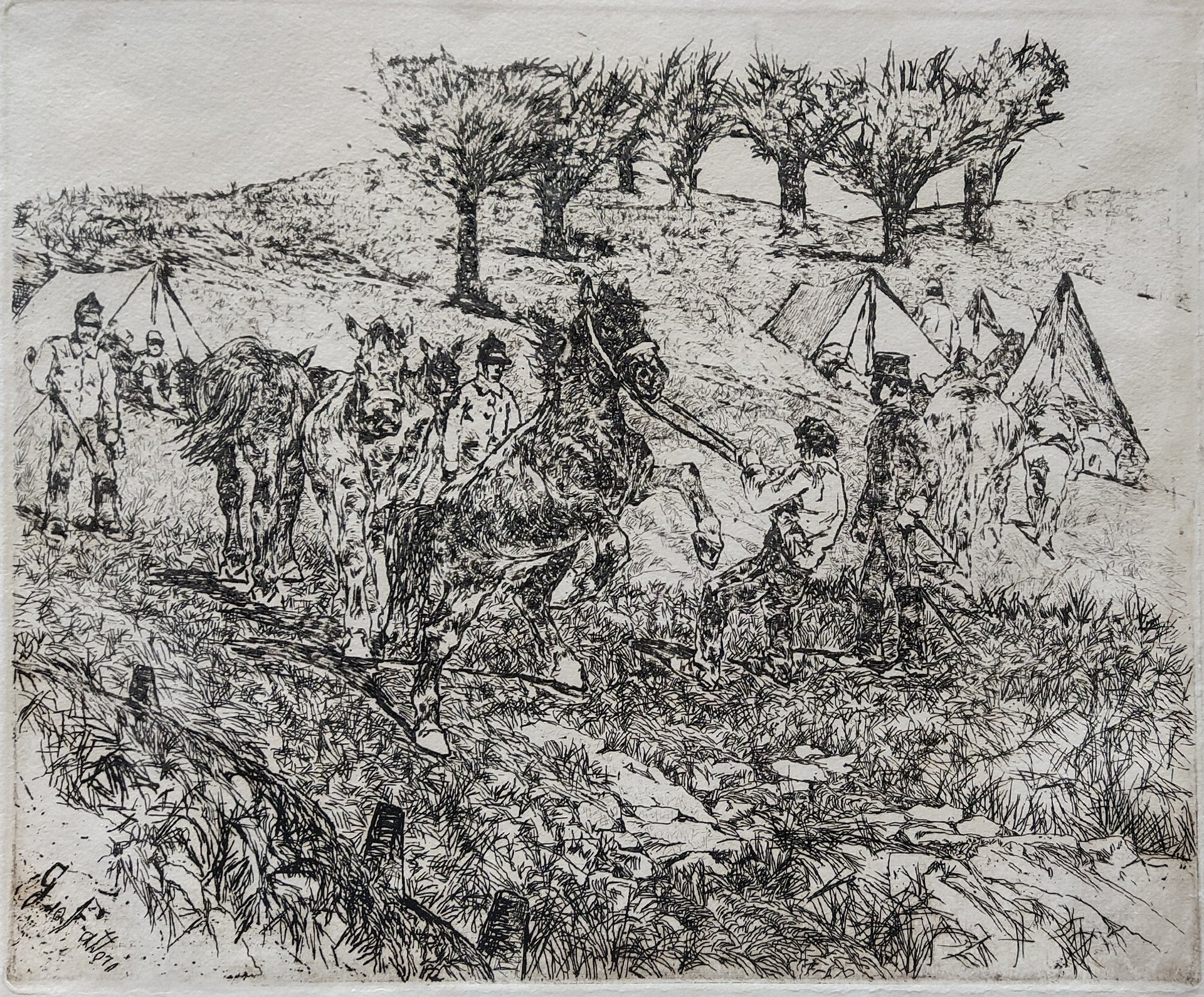 In quest'opera il paesaggio fa da sfondo ad un accampamento; vengono rappresentati soldati e cavalli e in primo piano la figura maestosa di un cavallo impennato. Splendida impressione. Prova di stampa con effetto di inchiostrazione a definire i vari piani della composizione. Più scura e con velatura in primo piano e più leggera a degradare verso lo sfondo, cielo lasciato volutamente bianco. Un effetto certamente voluto da Fattori stesso e perciò con il sapore della sperimentazione. Carta a mano con tramatura tipo tessuto. Buoni margini e qualche cedimento rinforzato in corrispondenza della battuta. Tracce di firma “G. F.” autografa a matita in basso a destra. Tracce di vecchio montaggio al verso. Due esemplari in tiratura originale sono conservati presso gli Uffizi (inv. 21497) e al Museo Civico di Livorno (inv. 72/337).