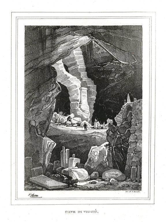 Veduta, antica ed originale, delle cave. "Il nome di Viggiù ad ogni lombardi richiama l'idea di piacchiapietre, l'arte a cui ivi, si può dire tutti, dedicansi dalla prima età, e n'escono poi anche scultori di rinomanza.Formano la ricchezza del borgo le cave di pietra arenaria e di marmo.Merita che ogni curioso delle rarità naturali visiti la cava di quella pietra nelle colline cicostanti a Viggiù. Là entro stanno gli scarpellini a lavorare protetti dalle intemperie, e se ne traggono anche massi enormi, che su carri matti non difficilmente conduconsi fino alla città.". C. Cantù. Autore: Elena Giuseppe dis. & Bertotti lit. Luogo: Viggiù. Anno: 1836. Tecnica: litografia. Dimensioni: 227x170 mm