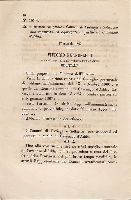 REGIO DECRETO COL QUALE I COMUNI DI CAVIAGA E SOLTARICO SONO SOPPRESSI ED AGGREGATI A QUELLO DI CAVENAGO D'ADDA
