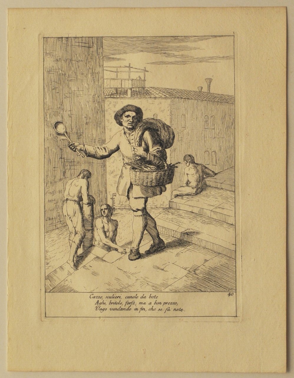 Acquaforte e bulino di mm 261 x 182. II/VI. Vergata veneziana tre lune, filigrana tre lune e scritta imperial. Bel foglio a pieni margini. Perfetta condizione. "Cazze, sculieri, canole da bote Aghi, britole, forfe; ma a bon prezzo; Vago vendando in fin, che se fa note". A destra in basso numero 40. Proveniente da "Le Arti che vanno per via nella Città di Venezia inventate ed incise da Gaetano Zompini. Aggiuntavi una memoria di detto autore" Venezia 1785. Magnifica incisione in acquaforte e bulino della serie delle "Arti che van per via" di Zompini, stampata in una rarissima prima edizione coeva nel 1753, ed in questo secondo stato nel 1785 dal residente britannico John Strange. Venne ripubblicato in Inghilterra altre quattro volte. Da una lettera di John Strange si viene a sapere che la tiratura della presente edizione era di cento o duecento copie. Dario Succi "Da Carlevarijs a Tiepolo, Incisori veneti e friulani del settecento" pag. 454. "Gaetano Zompini nacque a Narvesa il 29 settembre 1698; fu mandato a Venezia nella Scuola del Cavalier Bambini in que' tempi riputatissimo. Apprese dal suddetto oltre li principi del buon dissegno, anche in gran parte il suo modo di dipingere, ed uscito poi di detta Scuola si diede anche ad imitare la maniera di Sebastiano Ricci.Inventò pure e disegnò per il sig. Zatta stampatore in Venezia buona parte delle Figure per le Edizioni del Dante e del Petrarca da lui stampata. Questo degno Pittore visse però quasi sempre povero, avendo numerosa Famiglia. Antonio Maria Zanetti, lo tirò appresso di sé, impiegandolo in vari lavori e lavorò in gran parte sopra alcuni rami tratti da' disegni di Gio. Benedetto Castiglione. Quindi diede alle stampe una Raccolta delle Arti di Venezia, che vanno per via. &0 rami rappresentanti l'Arti suddette, a imitazione delle Arti di Bologna similmente inventate ed incise da Annibale Carracci. A quest'opera fatta all'acqua forte, della quale alcune copie furono anche miniate, aggiunse sotto ogni rame alcuni versi il Dottor Questini Prete di Santa Maria Mater Domini, amico dello Zompini. Mancò di vivere il 20 Maggio 1778 nell'avanzata età di 76 anni." (EN) Etching and burin, 261 x 182 mm. II/VI. Venetian laid paper with three moons, three moon watermark and imperial writing. Beautiful sheet with full margins. Perfect condition. "Cazze, sculieri, canole da bote Aghi, britole, forfe; ma a bon prezzo; Vago vendando in fin, che se fa note". Number 40 at the bottom right. From "The Arts that go by way in the City of Venice invented and engraved by Gaetano Zompini. Added a memoir by the said author" Venice 1785. Magnificent etching and burin from the series of the "Arts that go by way" by Zompini, printed in a very rare first contemporary edition in 1753, and in this second state in 1785 by the British resident John Strange. It was republished in England four more times. From a letter by John Strange we learn that the print run of the present edition was one or two hundred copies. Dario Succi "From Carlevarijs to Tiepolo, Venetian and Friulian Engravers of the Eighteenth Century" pag. 454. "Gaetano Zompini was born in Narvesa on September 29, 1698; he was sent to Venice to the School of the Cavalier Bambini, which was highly regarded at the time. He learned from the aforementioned, in addition to the principles of good design, also a large part of his way of painting, and after leaving the said School he also began to imitate the manner of Sebastiano Ricci. He also invented and designed for Mr. Zatta, a printer in Venice, a good part of the Figures for the Editions of Dante and Petrarca that he printed. This worthy Painter, however, lived almost always in poverty, having a large family. Antonio Maria Zanetti, took him with him, employing him in various works and worked largely on some copper plates taken from the drawings of Gio. Benedetto Castiglione. Then he published a Collection of the Arts of Venice, which are on the road. &0 copper plates representing the aforementioned Arts, in imitation of the Arts of Bologna similarly invented and engraved by Annibale Carracci. For this work he made Doctor Questini, Priest of Santa Maria Mater Domini, a friend of Zompini, added some verses under each copperplate to the etching, some copies of which were also illuminated. He passed away on May 20, 1778 at the advanced age of 76."
