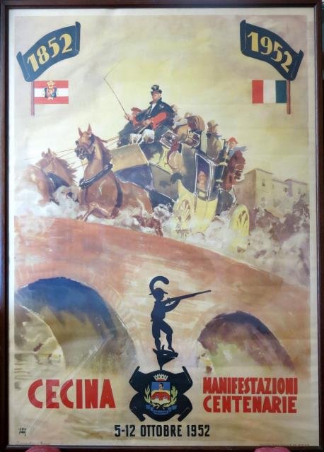 Zincografica Firenze, Autorizzazione Questura di Livorno N. 5161 del 25.9.52. Manifesto in colore in offset, firmato a stampa in basso a sinistra (si legge "Tabot") , cm 69 x 98. Raro manifesto disegnato, promosso dalla cittadina di Cecina (Livorno) in occasione dei festeggiamenti centenari commemorativi del Risorgimento. Con lo stesso soggetto esiste anche una cartolina, più comune a reperirsi sul mercato. Giorgio Tabet (Genova, 1904 – Cecina 2002) nasce a Genova dall'ingegnere livornese Guido Treves e dalla piemontese Luisa, entrambi di ascendenza ebraica. Primogenito di una famiglia numerosa, a soli quattro anni manifestò una spiccata propensione per il disegno, tanto da indurre i genitori, quattro anni dopo, a iscriverlo alle lezioni private del pittore e illustratore Giuseppe Mazzoni. La sua formazione artistica si sarebbe poi completata, diversi anni dopo, a Milano, dove si trasferì nel 1926. Qui, grazie alla mediazione dello zio Sabatino Lopez, frequentò lo studio del pittore Giuseppe Palanti e si iscrisse a un corso di scenografia presso l’Accademia di Brera. Si laurea in giurisprudenza nel 1926. Nei primi tempi, a Milano, condivide lo studio con Michele Cascella. Sabatino Lopez lo introduce all'attività di illustratore ed entra in collaborazione con "Lidel", rivistamolto raffinata di costume e moda italiane, pubblicata, con uscita mensile, dal 1919 al 1935. Entra in contatto con Enrico Sacchetti, Marcello Dudovich, Filiberto Mateldi, Piero Bernardini, Sinopico, Sto. Collabora con "La Lettura", "L'Ambrosiano", "Il Secolo XX". Viene presentato a Eugenio Gara (futuro marito di Milly Dandolo), redattore capo de "L'Illustrazione Italiana" (Treves). Collabora al "Guerin Meschino" insieme con Manca, Bisi, e altri vignettisti, a "Comoedia". Tabet lavora di preferenza a mezzatinta o a penna, i rapidi schizzi ritraggono le personalità dell'epoca: autori, attori, artisti, uomini illustri, uomini di sport. Dal 1934 al 1936 collabora anche al "Corriere dei Piccoli". Conosce Maria Fahringer, attrice viennese, da cui avrà un figlio, Guido. Sempre negli Anni Trenta comincia la sua attività di illustratore editoriale: illustra alcune copertine della collana "Le scie" e circa ottanta copertine della collana "Omnibus" (Mondadori), inclusa la prima cover di "Via col vento"; alcune copertine dei Gialli Mondadori, de "Il romanzo mensile", di "Oggi", de "La Domenica del Corriere" e locandine di cinema. Negli Anni Quaranta sviluppa l'attività cartellonistica e pubblicitaria e negli anni Quaranta e Cinquanta illustra moltissime copertine per la “Biblioteca delle Signorine” (Salani) (fra queste i “Romanzi della Rosa” e i “Grandi Romanzi Salani”). É pittore e ritrattista. Sono noti i suoi ritratti di Anna Magnani e di Alida Valli, e di altre personalità del cinema e del teatro. Nel 1968 vince la seconda edizione del "Premio Illustrazione" istituito da “Epoca”. Muore a Cecina (Livorno) nel 2002. La personale tecnica di Tabet si fondò quasi esclusivamente sul costante confronto con le necessità illustrative che di volta in volta gli proponevano i suoi lavori. La sua è stata una produzione vasta ed eterogenea che, estendendendosi lungo l’arco di circa sessant’anni, ha opere di pittura, caricatura, fumetto e illustrazione, campo in cui raggiunse i risultati più notevoli (Fonte: Enciclopedia Treccani online e altre). Molto buono lo stato di conservazione. .