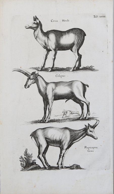 Tavola tratta da Historia Naturalis de quadrupetibus libri … Francoforti ad Moenum impensis Haeredum Math: Meriani; s.d. (Unito a:) Historiae Naturalis de Auibus libri […] di Johannes Jonston, con le incisioni intagliate da Matthaeus Merian. Jonston (1603-1675), scienziato polacco di origine scozzese, frequentò l’università di St. Andrews dal 1622, interessandosi con maggior attenzione agli studi di ebraico e scienze naturali fino al marzo del 1625. Nei successivi quattro anni si trasferì all’estero, ma tornò in Inghilterra due volte frequentando corsi di botanica e medicina a Cambridge. Fece ulteriori viaggi nel continente stabilendosi a Leida nel 1634 dove ottenne la cattedra di medicina. Incisione in rame, in buono stato di conservazione. Copper engraving taken from the ' Historia Naturalis de quadrupetibus libri … ' Francoforti ad Moenum impensis Haeredum Math: Meriani; ' s.d. (United to:) ' Historiae Naturalis de Auibus libri VI… ' by Johannes Jonston, with the engraving carved by Matthaeus Merian. Jonston (1603-1675) was a Polish scientist of Scottish origins. He attended St. Andrews University from 1622, taking more interest in Jewish and Natural Sciences studies, until March 1625. He studied also botany and medicine in Cambridge. In 1634, in Leiden, he became professor in medicine. Copper engraving, in good condition. Cfr.