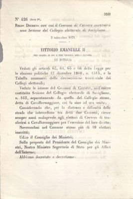 REGIO DECRETO CON CUI IL COMUNE DI CERVERE COSTITUIRA' UNA SEZIONE DEL COLLEGIO ELETTORALE DI SAVIGLIANO