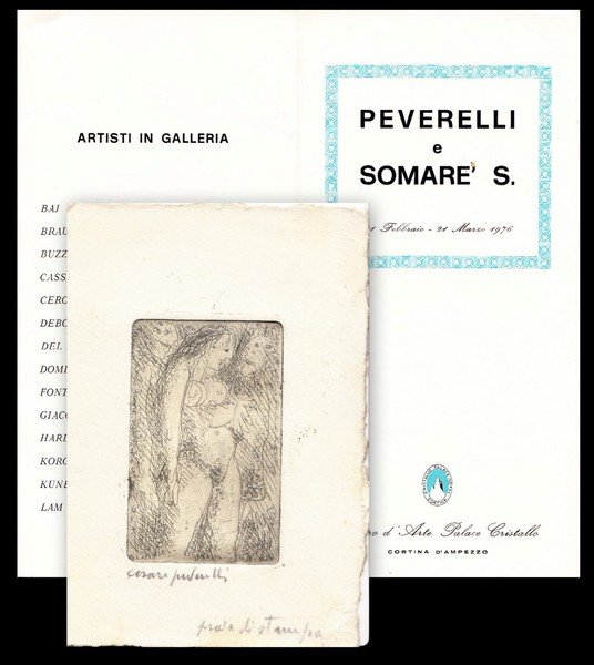 Note: incisione originale all'acquaforte "prova di stampa" firmata da Cesare Peverelli. Catalogo in 16°, pp. 4 con riproduzioni b.n. n.t. delle opere dell'artista; buoni ess.