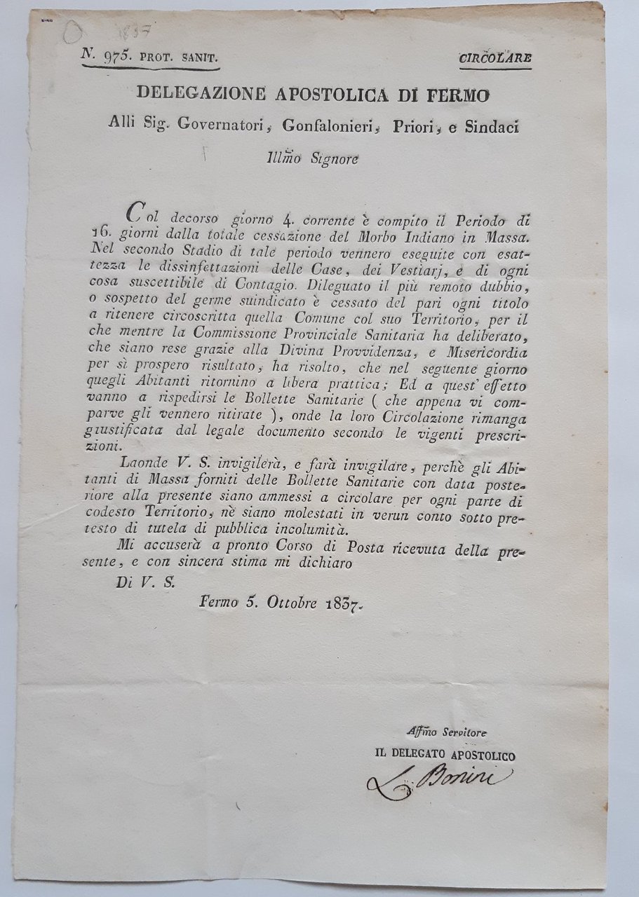 Delegazione apostolica di Fermo fine del colera e indicazioni da seguire come disinfezione delle case, vestiari. distribuzione delle bollette sanitarie lasciapassare per la libera circolazione 5 ottobre 1837