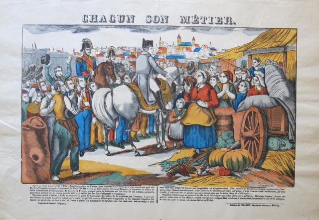 Epinal, Jean Charles Pellerin, 1850 - 1870 circa. Incisione su legno in coloritura d'epoca, cm 43 x 63 circa (il foglio). La veduta è stata incisa dal Georgin e stampata dal Pellerin, il più importante editore di Epinal, cittadina del dipartimento dei Vosgi, nella regione della Lorena. Al margine inferiore la didascalia descrittiva dell'episodio: Napoleone a Parigi, fra la folla che esulta. Piega centrale editoriale, minimi difetti marginali del foglio, peraltro in piacevole coloritura e buona conservazione.