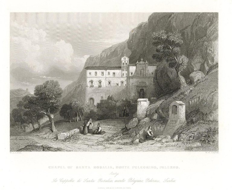 Stampa, antica ed originale, con rappresentata la Cappella di Santa Rosalia. Autore: Leitch W. L. dis. Luogo: Palermo. Anno: 1851. Tecnica: incisione in acciaio. Dimensioni: 127x188. Opera inserita in alcune edizioni tra cui " Les Iles e les Bords de la Mediterranée comprenant la Sicile ." di M. Clément Pellé edita a Londra e Parigi da Fisher, Son & C. nel 1841 - "Il Mediterraneo illustrato le sue isole e le sue spiagge", edita a Firenze nel 1851 presso Spirito Batelli