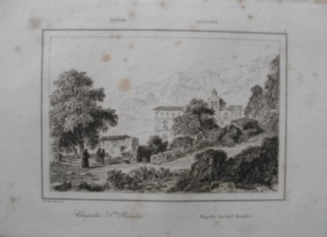 Seconda meta' dell' '800. Dalla "Italie Pittoresque", incisione su rame, b/n, cm 13,5 x 20,5 (il foglio). Piccola veduta di Agrigento con la Chiesa di Santa Rosalia.