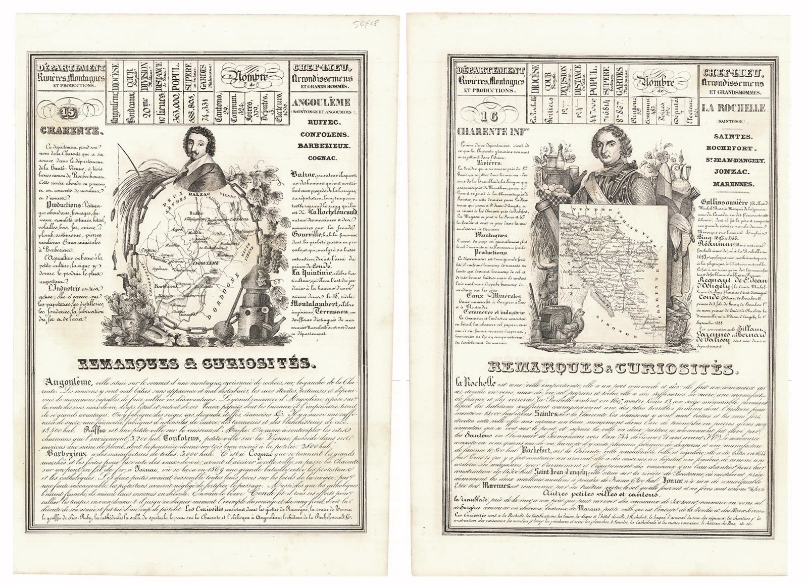 Carta n°15 del Dipartimento di Calvados inserita in un medaglione centrale sormontato da un ritratto di Balzac. Questa è circondata da spiegazioni e osservazioni riguardanti l'economia, la geografia e la storia di quel territorio in cui si evidenziano le cittadine di Angouleme (Saintonge et Angoumois), Ruffec, Conflolens, Barbezieux, Cognac. Al retro la carta n° 16 del Dipartimento di Charente Inf.re inserita in un medaglione centrale sormontato da un ritratto di Gallissounière. Anche questo è circondato da spiegazioni e osservazioni riguardanti l'economia, la geografia e la storia di quel territorio in cui si evidenziano le cittadine di La Rouchelles (Saintogne), Saintes, Rochefort, S,t Jean-D'Angely, Jonzac, Marennes.Inserita nell'opera "Nouvelle Géographie et Statistique de La France Alger et La Belgique, Suive d'un Traité sur le Mone entier. Ornée de 95 cartes approuvée de l'Université pa J. Henry, maitre de Pension" edita dall'Autore Alexandre Corbin Litografo ed editore a Tours nel 1842