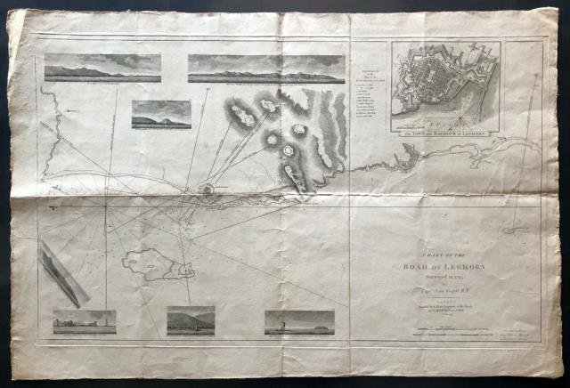 London, Publisched by W. Faden Geographer to His Majesty and to H R H the Prince of Wales Jan 1797. Si vende in Livorno presso Giovanni Aliprandi in Darsena, N. 295. Incisione in rame all’acquaforte, b/n, cm 47 x 77 (alla lastra), cm 55 x 82 (il foglio), stampata su carta forte. Titolo in basso a destra, sotto le indicazioni editoriali, ancora più sotto, spostate sull’angolo di sinistra, le informazioni di vendita; in alto a destra, in riquadro, una piccola pianta della città titolata “The Town and Harbour of Leghorn”, alla sua sinistra una minuta legenda a 11 toponimi; sette piccole vedute al margine superiore, sul lato sinistro e lungo il margine inferiore della stampa illustrano vari tratti di costa livornese con riferimenti marittimi, torri (tra questi ben evidenziato è lo scoglio con la torre della Meloria) e i monti che si vedono guardando oltre la città. Numerose le tratte disegnate che partono dalla città di Livorno. Rara. Esistono esemplari senza la pianta della città (Piero Frati, “Livorno nelle antiche stampe”, pag. 145, scheda 269). Margini con usuale imperfezioni e punti di ingiallimento, alcune pieghe della carta non disturbano l’esemplare nell’insieme in buono lo stato di conservazione.
