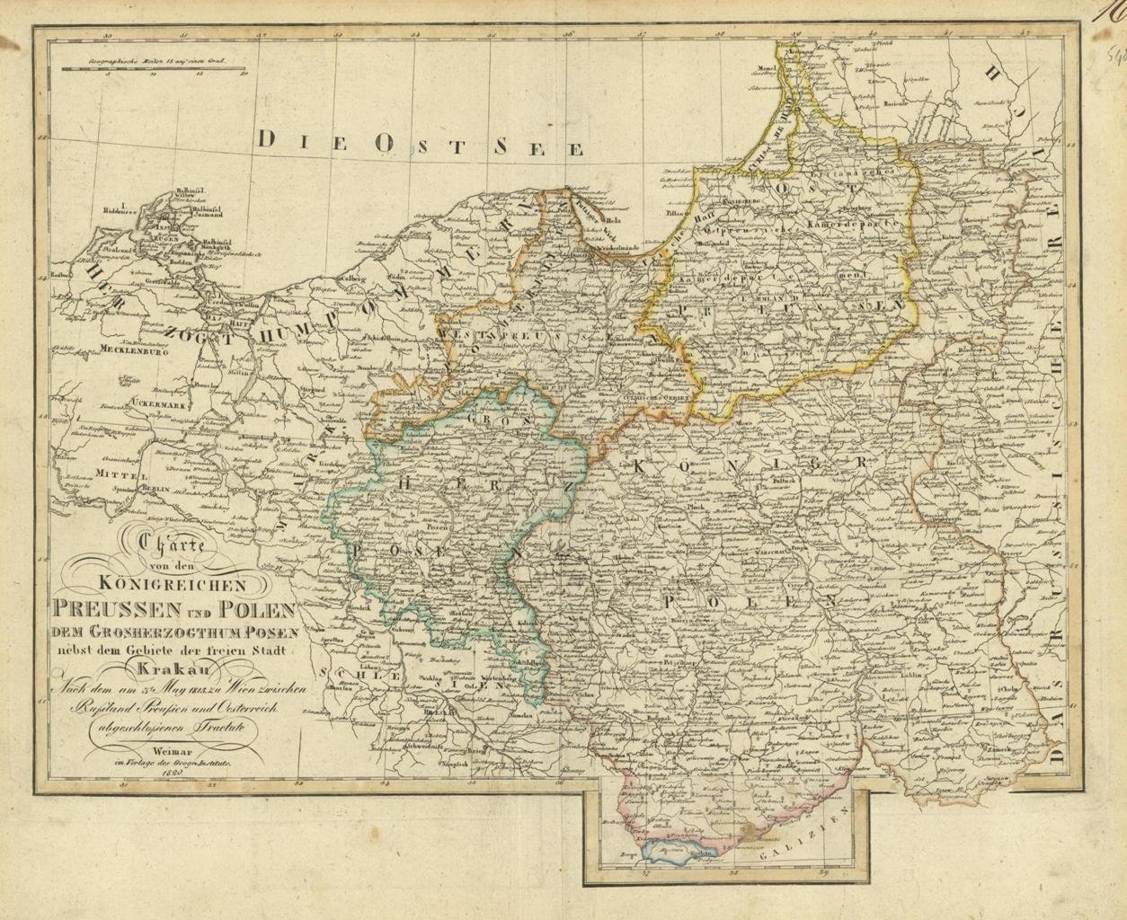 Carta geografica, antica ed originale, con coloritura coeva ai confini. La mappa edita nella città tedesca di Weimar è stata disegnata nel 1820 e rappresenta il territorio della Germania setentrionale e della Polonia. Autore: Geograph: Instituts edit. Luogo: Prussia e Polonia. Anno: 1821. Tecnica: incisione in rame. Dimensioni: 340x417.